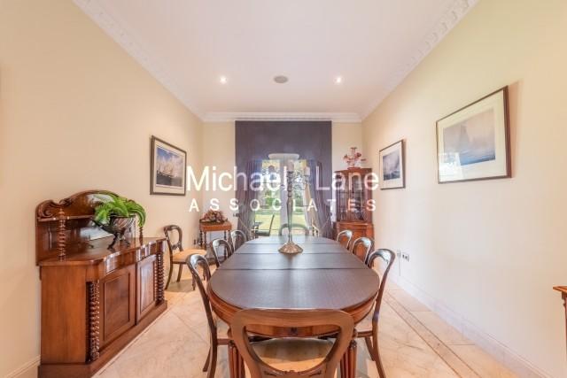 The beautiful entrance hall leads to a large sunken formal lounge boasting a large fireplace and multiple seating areas. This large living room leads onto the enclosed terrace which has more comfortable seating and a large dining area. Fitted with glass curtains, this is a perfect area for dining outside in both warm and cooler seasons. One of the many high-end features is the swimming pool complex with cascading falls and a hot tub jacuzzi.