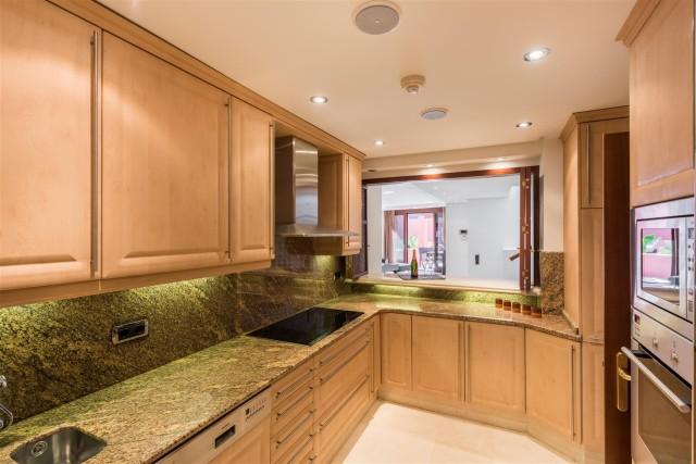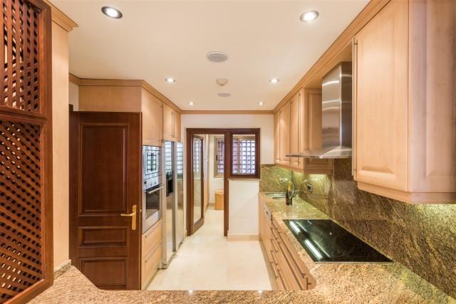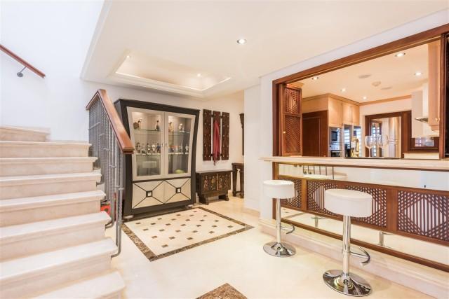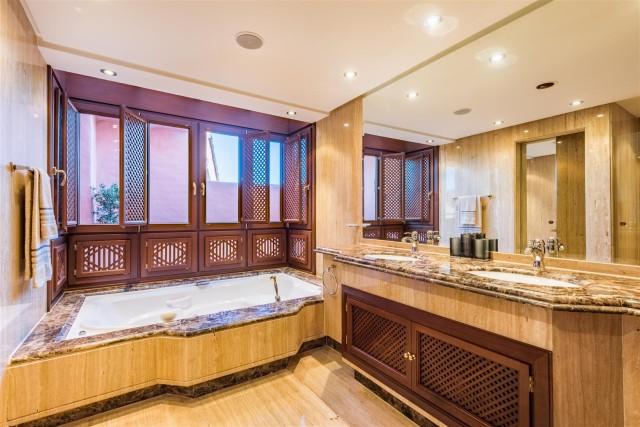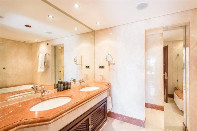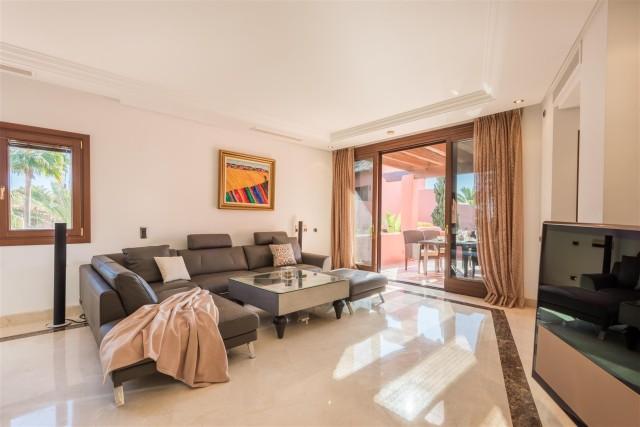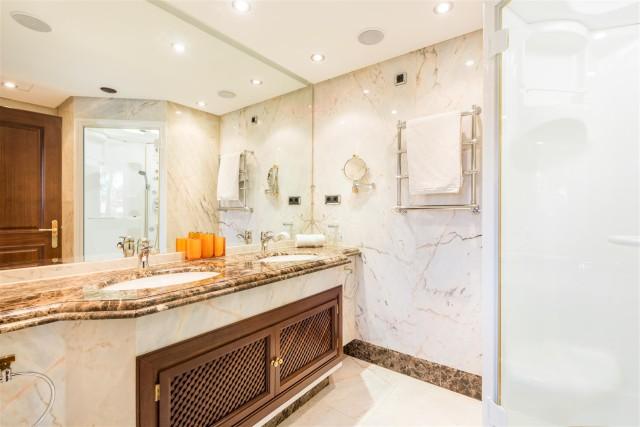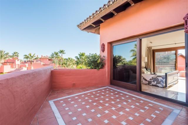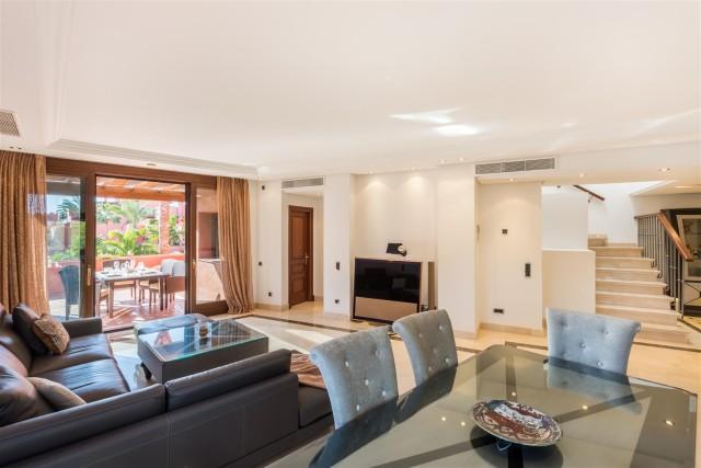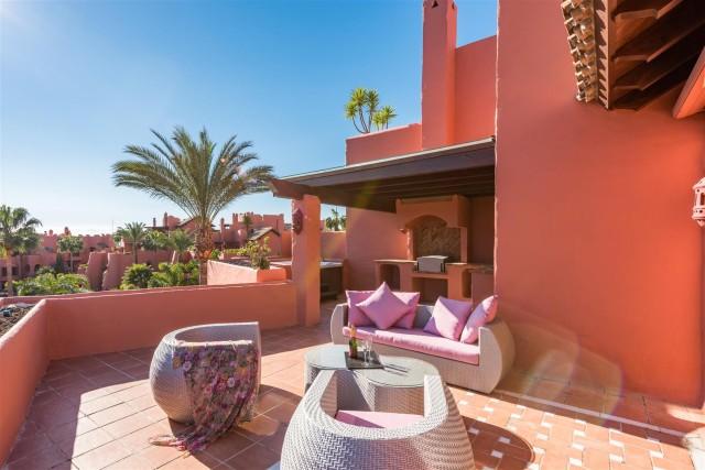Beachfront luxury penthouse for sale in the New Golden Mile Estepona. This penthouse is located in Torre Bermeja, one of the most exclusive gated developments of the New Golden Mile area with nice landscaped gardens, gym, sauna, 24h security service, tropical style pools and indoor heated pool and everything else that the Mediterranean lifestyle can offer. Excellent sandy beaches and all amenities are nearby, lovely resort Estepona is 5 minutes away and glamorous Puerto Banús is only in 10 minutes´ drive. This property offers 3 bedrooms en-suite (one with indoor Jacuzzi); modern fully equipped kitchen; large and bright lounge with dining area and access to terrace, bar area, underground parking and a private storage room. Its interior design is functional and fabulous. Excellent creamy marble floors, natural colours palette with bright accents, high quality furniture and stylish accessories, modern air conditioning and alarm systems, central heating, fireplace, BBQ area, fitted wardrobes, home automation system, Jacuzzi - it has all the imaginable comfort you are looking for. Several nicely furnished large terraces (130m2) and a solarium terrace on top with al fresco dining facilities and an outdoor Jacuzzi enjoy spectacular views over the gardens and blue Mediterranean Sea towards the North African coastline.