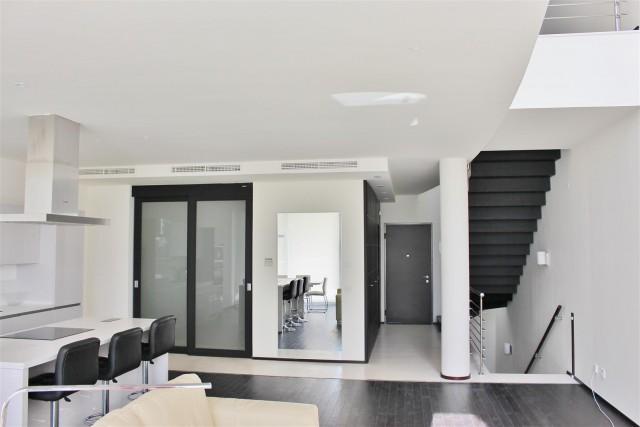 Exclusive modern townhouse for sale on the Marbella Golden Mile. Located in a prime position and boasting spectacular views over the Mediterranean Coast line, this prestigious property was recently finished and the complex have been awarded The Best Architecture Bentley Award and consists of only 58 private properties. The urbanization offers security, indoor pool, jacuzzi, gym and is surrounded by a pine forest. The property have 3 levels and is disributed as follows: - On the lower level: private garage with a laundry area. On the ground level open plan lounge with American kitchen leading on to the terrace with open sea views, guest toilet and additional guest quarters with a shower and private entrance. On the top level two en-suite bedrooms with large bathrooms, both with built in wardrobes and terraces, spacious and bright The property boasts domotics, underfloor heating throughout.