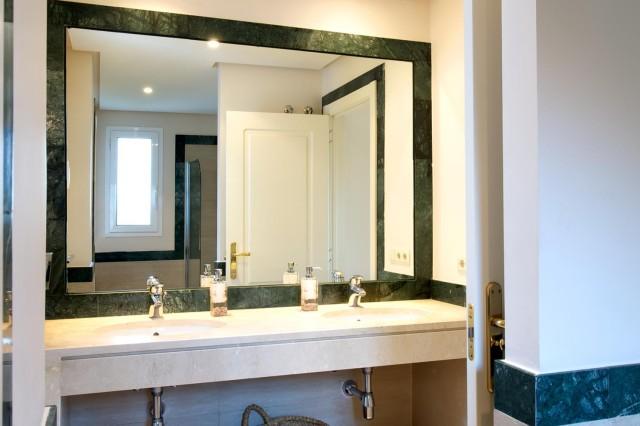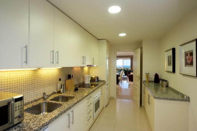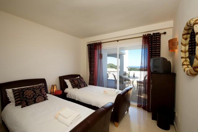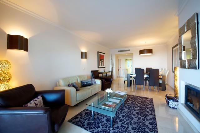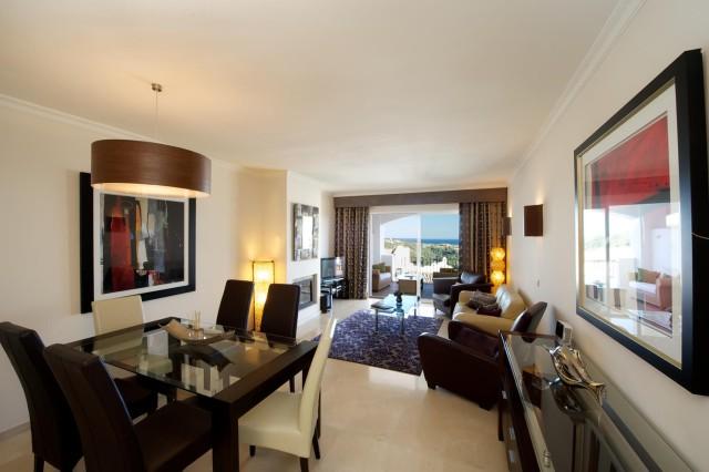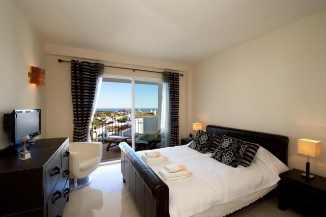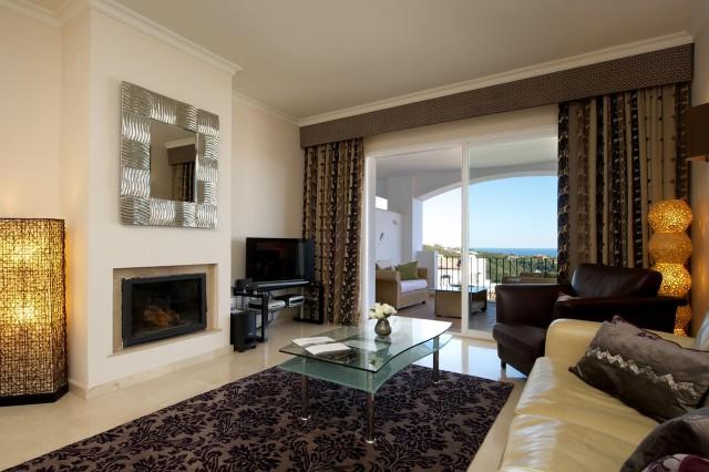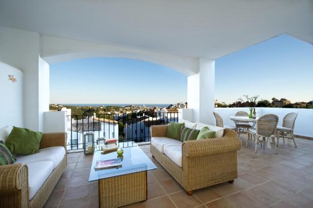 This superb corner 3 bedrooms 2 bathrooms first floor apartment offers you privacy and fabulous sea and mountain views. The Mediterranean style urbanisation features beautiful well-kept gardens, communal areas and swimming pool. The property provides you with three airy and bright bedrooms, master bedroom with en suite bathroom and walk in dressing area, spacious living room, cream marble flooring, kitchen with Bosch appliances, laundry area, air conditioning (cool & warm), safe, satellite TV, and pre-installation of alarm and fire place.