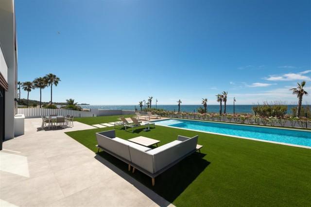 Frontline beach, designer villa for sale in Estepona. Stunning beachfront luxurious villa set in a magnificent garden with a large outdoor swimming pool and panoramic sea views. Inside, the basement level offers a luxurious spa with indoor heated swimming pool and sauna, and the roof top terrace offers a chill-out zone with a Jacuzzi on a wooden deck.