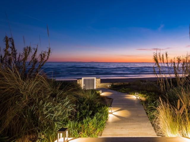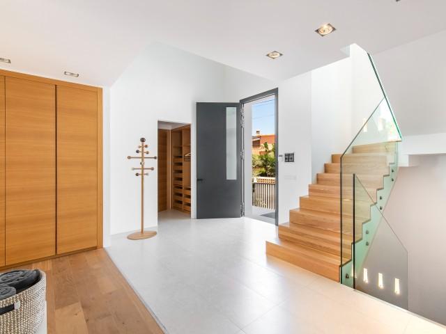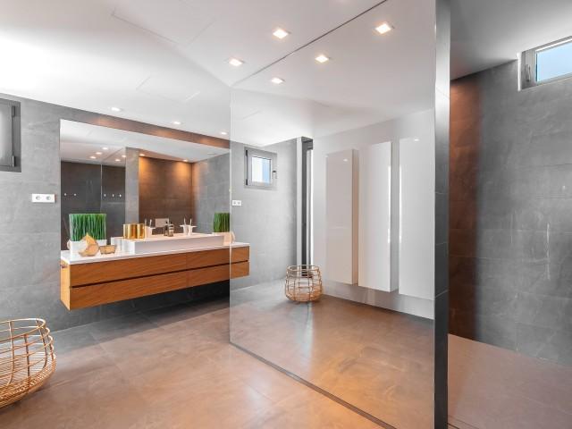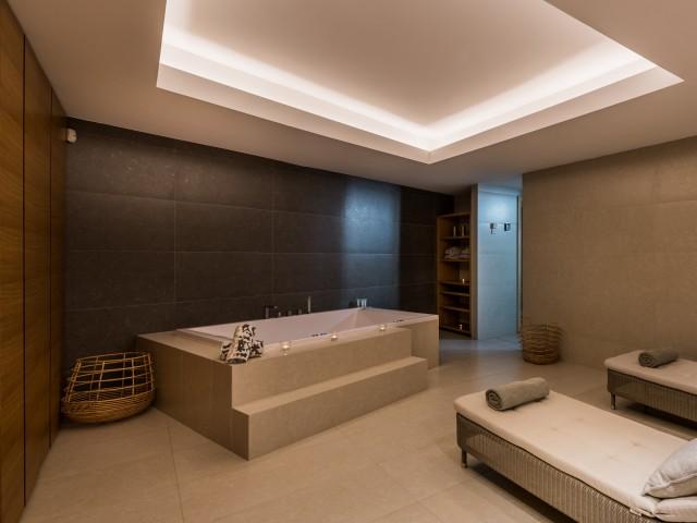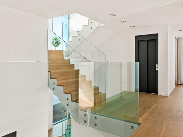 The beautifully landscaped private dune is offering complete privacy to the relaxing and dining areas on the terrace. On the entrance level there is also a guest bedroom with fitted and walk-in wardrobe, and a bathroom with shower, toilet, and basin. First floor: Upstairs, on the first floor, there is the master bedroom, with two sets of wardrobes, and master bathroom with shower, wide double basin, toilet, and access to the terrace. There are further two bedrooms and one shared bathroom with shower, toilet and basin. Each of these bedrooms has direct access to the terrace facing the sea and offering amazing views to the beach. Solarium: On the rooftop, there is a fabulous open terrace with fitness equipment, a pergola, and a Jacuzzi, and, of course, great 360 degree views. Basement floor: On the lower floor level, there are two further double bedrooms with natural light, fitted wardrobes, a bathroom with basin, shower and toilet. The lower level also features a SPA with Jacuzzi bath, steam bath, sauna and showers; storage rooms and utility room. Each floor is served by the elevator and oak staircase with glass railings.