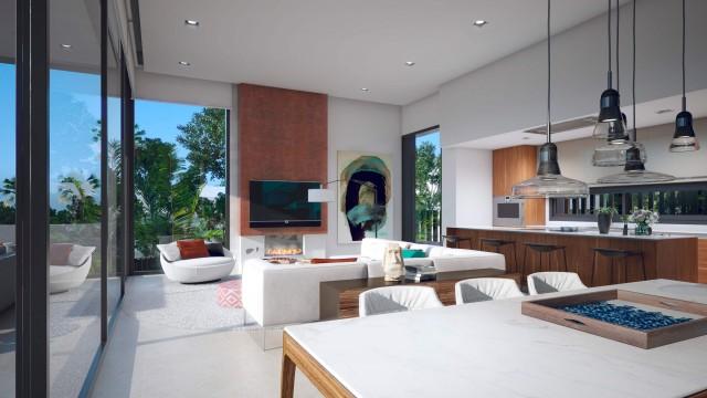 Elke villa heeft een eigen ingang en oprit, met ondergrondse parkeergarage voor twee auto''s. Verder is er een centrale, ruime woonkamer met hoge plafonds, open keuken en directe toegang tot het zwembad in de privé tuin. Een ruim zuidelijk overdekt terras biedt schaduw in de zomer, terwijl het zwembad continue geniet van de volle zon.