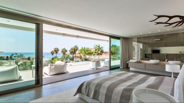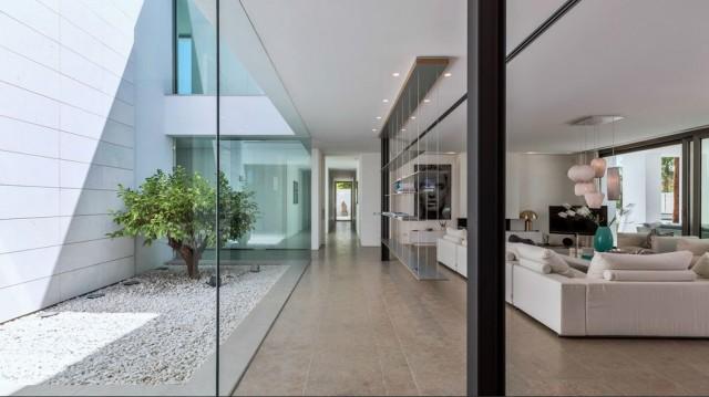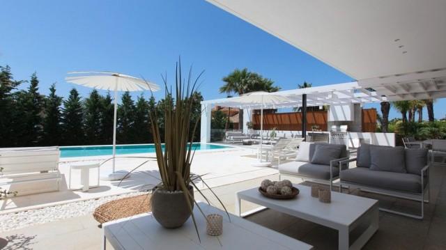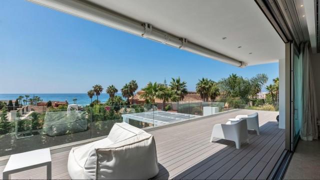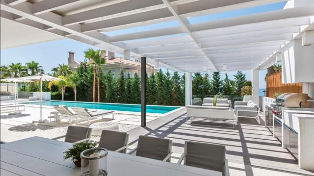 This fantastic villa is the only contemporary design property with luxurious finishes for sale in the exclusive urbanization of Bahía de Marbella, Marbella East, known for the beauty of its dune beaches, elegant common areas and 24 hour security system. The house is located just 150 meters from the beach, stands out for a minimalist design with refined lines and a perfect integration of the interior and exterior spaces favoring a luxurious and relaxing lifestyle. The main floor offers an impressive space without limits that includes an interior patio, living room, dining room and American kitchen of Bulthaup design with Gaggenau equipment. The entire area opens through large doors to the elegant outdoor areas of terraces and barbecue space that surround the heated pool. Also on this floor are a TV room, 4 bedrooms with direct access to the outdoor areas and 3 shower rooms, a guest toilet. The upper floor is exclusively dedicated to a magnificent master bedroom with open sea views, several terraces, dressing room, integrated bathroom. The villa is completed in the basement with a gym room, a Home Cinema, a wine cellar, bathroom, laundry room, storage rooms and a large garage for 3 cars. Other features: security windows, underfloor heating, home automation, solar panels and much more. The villa is completed in the basement with a gym room, a Home Cinema, a wine cellar, bathroom, laundry room, storage rooms and a large garage for 3 cars. Other features: security windows, underfloor heating, home automation, solar panels and much more. The villa is completed in the basement with a gym room, a Home Cinema, a wine cellar, bathroom, laundry room, storage rooms and a large garage for 3 cars. Other features: security windows, underfloor heating, home automation, solar panels and much more.