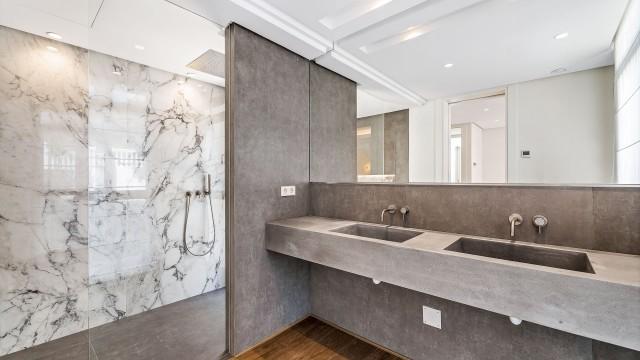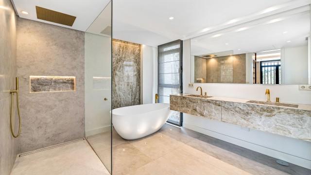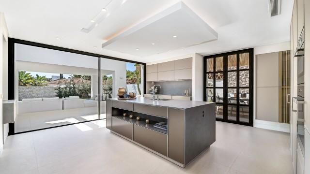 Occupying an elevated plot, the villa is built to exceptionally high qualities and is absolutely stunning, offering chic interiors, as well as a beautiful garden area designed by the leading landscaping company in Marbella. An impressive entry with a cascading waterfall leads to the 7 meter high entrance, which gives way to a chic hall leading to an impressive living area of over 100m2, which includes a beautifully decorated large living room, with an impressive modern fireplace, a luxurious and exceptionally spacious kitchen, with a separate laundry area and a dining room with double height ceiling.