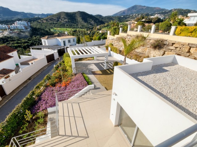 This bright and spacious 4 bedroom villa on 3 levels is built to high standards. The kitchen is fully fitted with the latest Bosch appliances, the large living room has high ceilings and a fireplace, leading to a spacious private terrace and a garden with a fantastic view of the Benahavis mountains. On the same floor there is also a separate wing with 2 bedrooms sharing a bathroom. The master suite, which also enjoys stunning views, is completed by a walk-in closet, a bathroom and a spacious terrace. On the other side of the gallery is the 4th bedroom which is en-suite and with its own private terrace. In the basement there is the laundry room plus a multipurpose room with a separate entrance. All kinds of amenities, the quaint town of Benahavis and several golf courses are just a short drive away.
