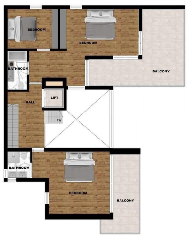 On the second floor there are one large bedroom with a separate bathroom and 2 normal size bedrooms, 1 bathroom.