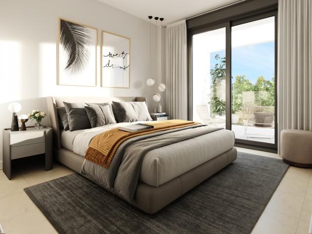 Elviria Beach Residences is a private development with perimeter fence, large green areas, communal swimming pool, gym and co-working area.