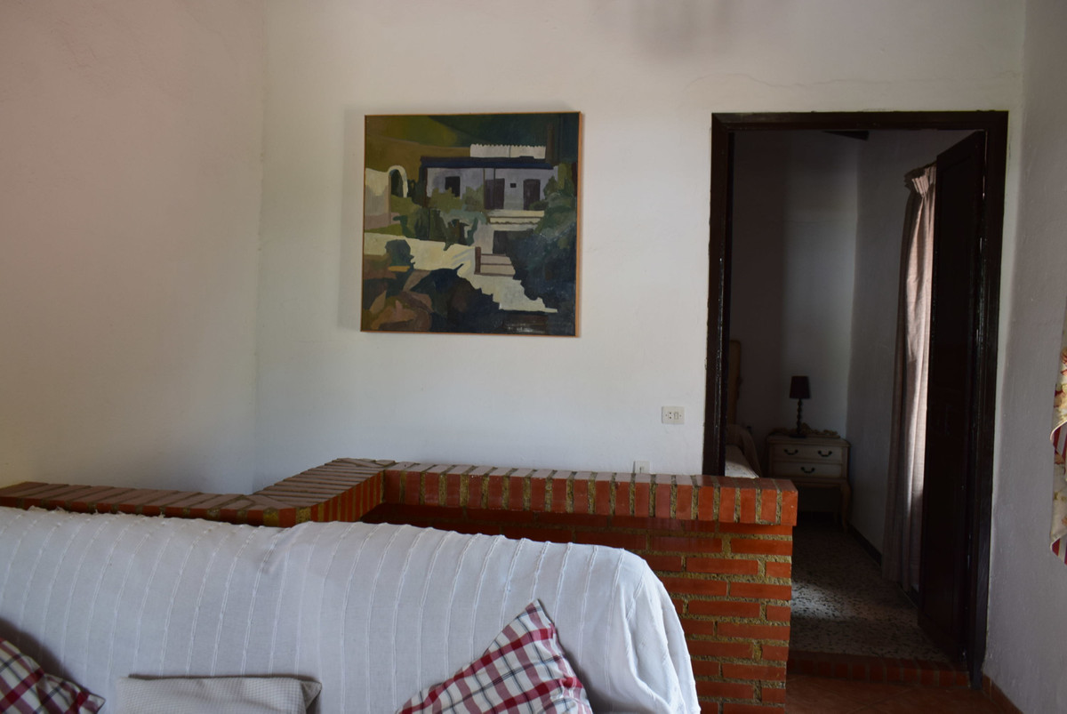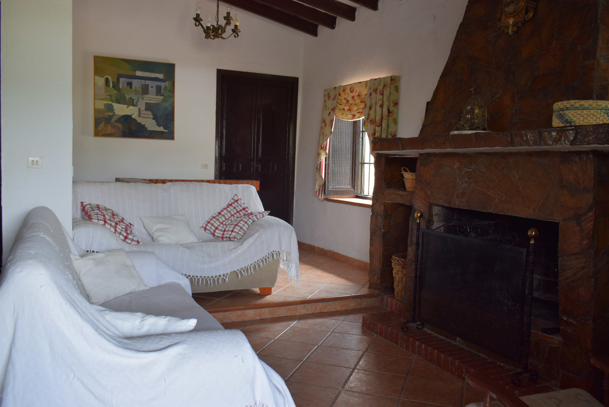 From the terrace you enter the living room with a fireplace. This is the antique part of the house with the original, antique windows, shutters, doors and beams. From the living room you can oversee the terrace and the landscape.