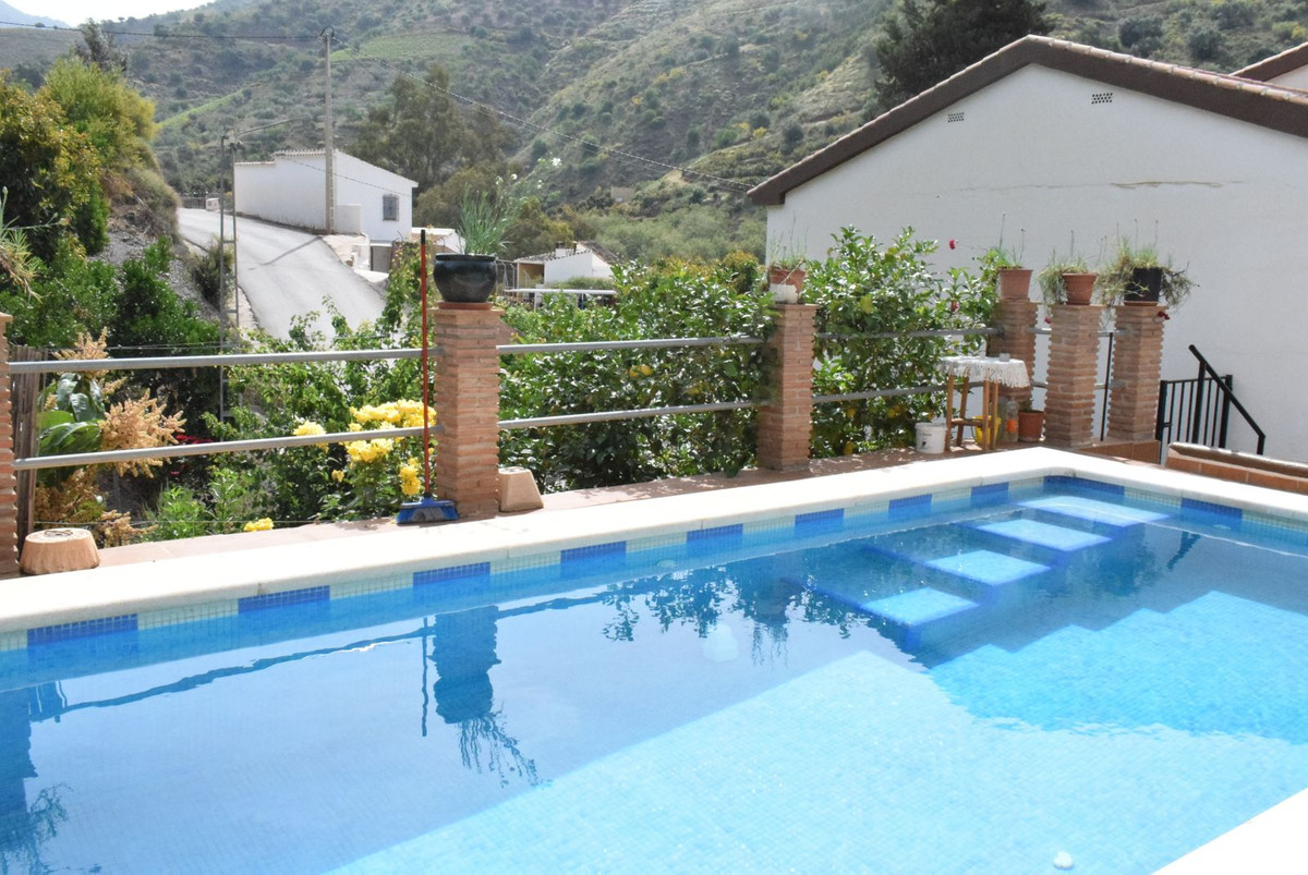 This detached house is located in the area of Rio Bermuza, a 10 minutes drive to the village of Viñuela and only a 20 minute drive to the coast. The accommodation is distributed on two floors and comprises a hallway, large lounge/dining room with a fireplace, a fully fitted kitchen, 5 spacious bedrooms, 2 bathrooms and a huge garage for 3 cars. There are several terraces, a BBQ area with a storeroom, a pool area, and a garden.