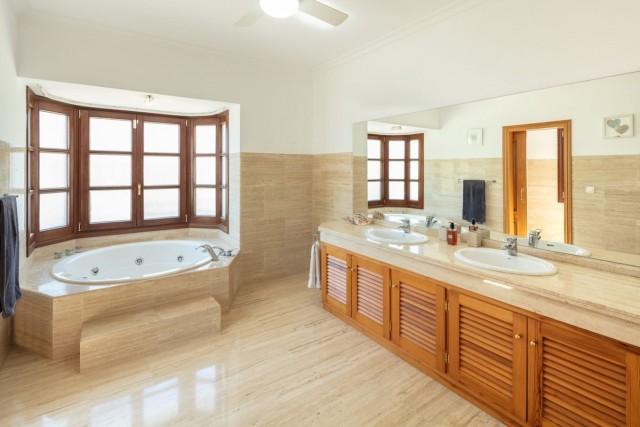 The entrance hallway has access to the guest toilet and to the two generous guest bedrooms sharing one bathroom. Terrace access is from the living room and leads down to the pool area beyond. Upstairs, we find the third large guest bedroom with en-suite bathroom featuring a double basin, a full jacuzzi bath as well as a large standalone walk-in shower. The master bedroom suite is a real highlight, being very generously sized and featuring a walk-in dressing room as well as a very large bathroom with double basin, jacuzzi bath and walk-in shower.