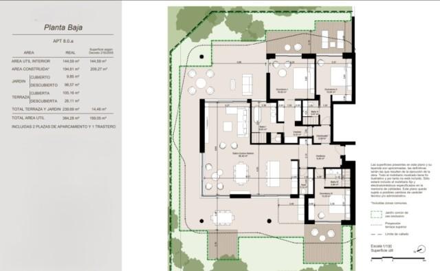 Located in La Reserva de Sotogrande, this is a brand new apartment development. This apartment is on the ground floor and has 3 bedrooms, 3 bathrooms and a garden. Contemporary style finishes. Large and light living and dining areas leading to terraces with views of the golf and parkland. This development includes 24 hour security and free membership to the country club including the famous Beach Club.