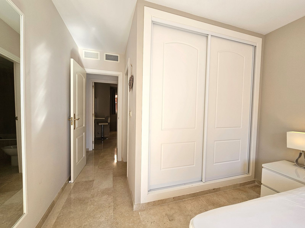 This fantastic 2 bedroom, 2 bathroom apartment is located in the popular area of Elviria, Marbella. Located in a front line golf development with 4 swimming pools, this property boasts fabulous open sea and mountain views and is just a few minutes drive from all amenities. Located in Los Lagos de Santa Maria, this first floor apartment has a large terrace with enough space for dining table, sofas and sun beds.The apartment comprises of 2 spacious bedrooms, 2 marble bathrooms (one ensuite), and a lovely bright sitting room/dining room that takes you straight onto the large terrace. The kitchen is fully fitted with a handy laundry/utility room and there is hot and cold A/C throughout the apartment. The configuration of this apartment cleverly allows the possibility of opening up the kitchen and creating an open plan living area if wanted by the new owners.