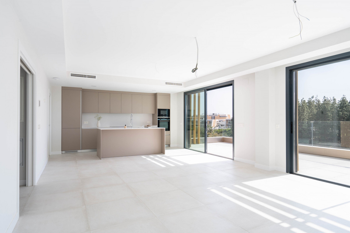 This home has been designed to balance style with comfort. The open-plan communal areas and generous interiors are crafted to flood the space with natural light, providing an incredibly inviting living experience. The expansive living room features large picture windows and high-quality porcelain floor tiles, creating an effortlessly bright and airy environment that maximizes daylight throughout the day. The spacious terrace offers panoramic sea views—an ideal setting to unwind and witness breathtaking sunsets. The kitchen flows seamlessly into the living area, contributing to the open, fresh ambiance that’s perfect for relaxed, everyday living. Top-tier finishes, including quartz countertops, integrated appliances, and ambient LED lighting, further elevate the space, adding sophistication and warmth. In the bathrooms, large-format porcelain tiles exude elegance, underscoring the attention to detail and commitment to quality design.