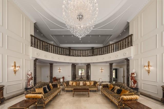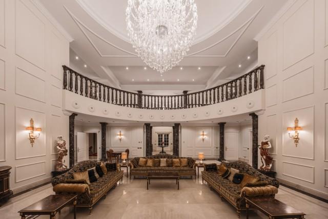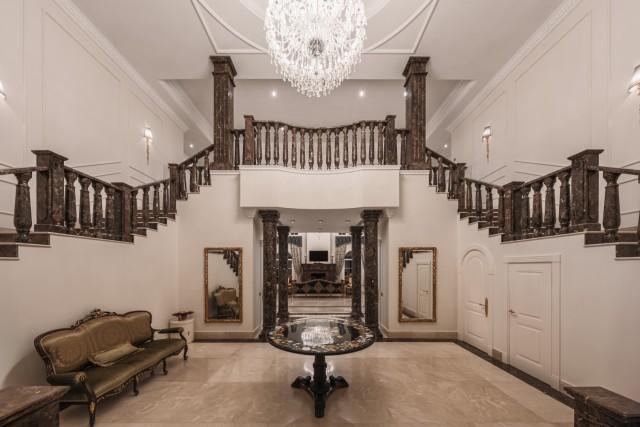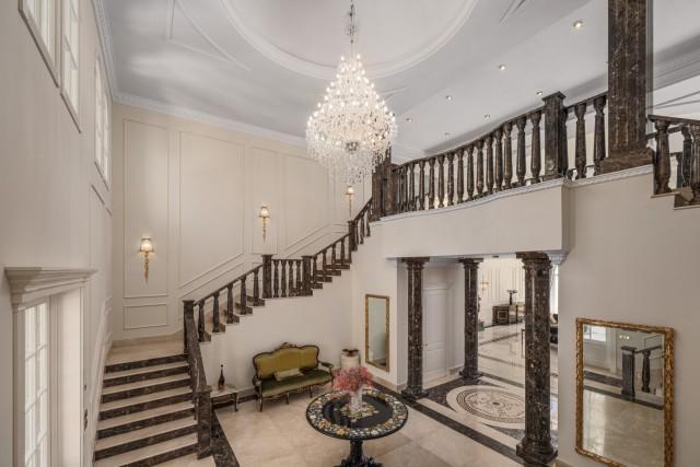 This magnificent home is a remarkable three-floor estate for sale in the prestigious gated community of Sierra Blanca on the Costa del Sol. Built just ten years ago, this sophisticated residence seamlessly blends neoclassical architecture with modern luxury. The moment you enter, you’re greeted by an imposing foyer with a soaring 9-meter-high ceiling and the gleam of electric chandeliers, reflecting the elegance and thoughtful design that carries throughout the home.