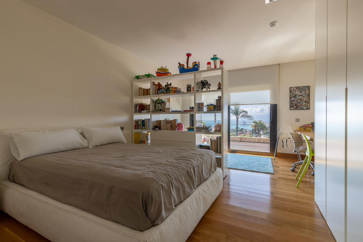 The ground level of the villa with access to the garden consists of games and barbecue area that features a dumbwaiter connecting directly to the kitchen. The upper level with access to the pool area comprises wine cellar, fully-equipped gym, jacuzzi, sauna, Turkish bath, and a dressing room. The first floor welcomes you into a spectacular living room offering breathtaking panoramic sea views, dining area and state-of-the-art kitchen with an island. Furthermore, on this level are 4 en-suite bedrooms, laundry room and service apartment with two bedrooms, lounge and a bathroom. The second floor houses an office room with access to the solarium and en-suite master bedroom that includes walk-in closet and opens onto a vast terrace.