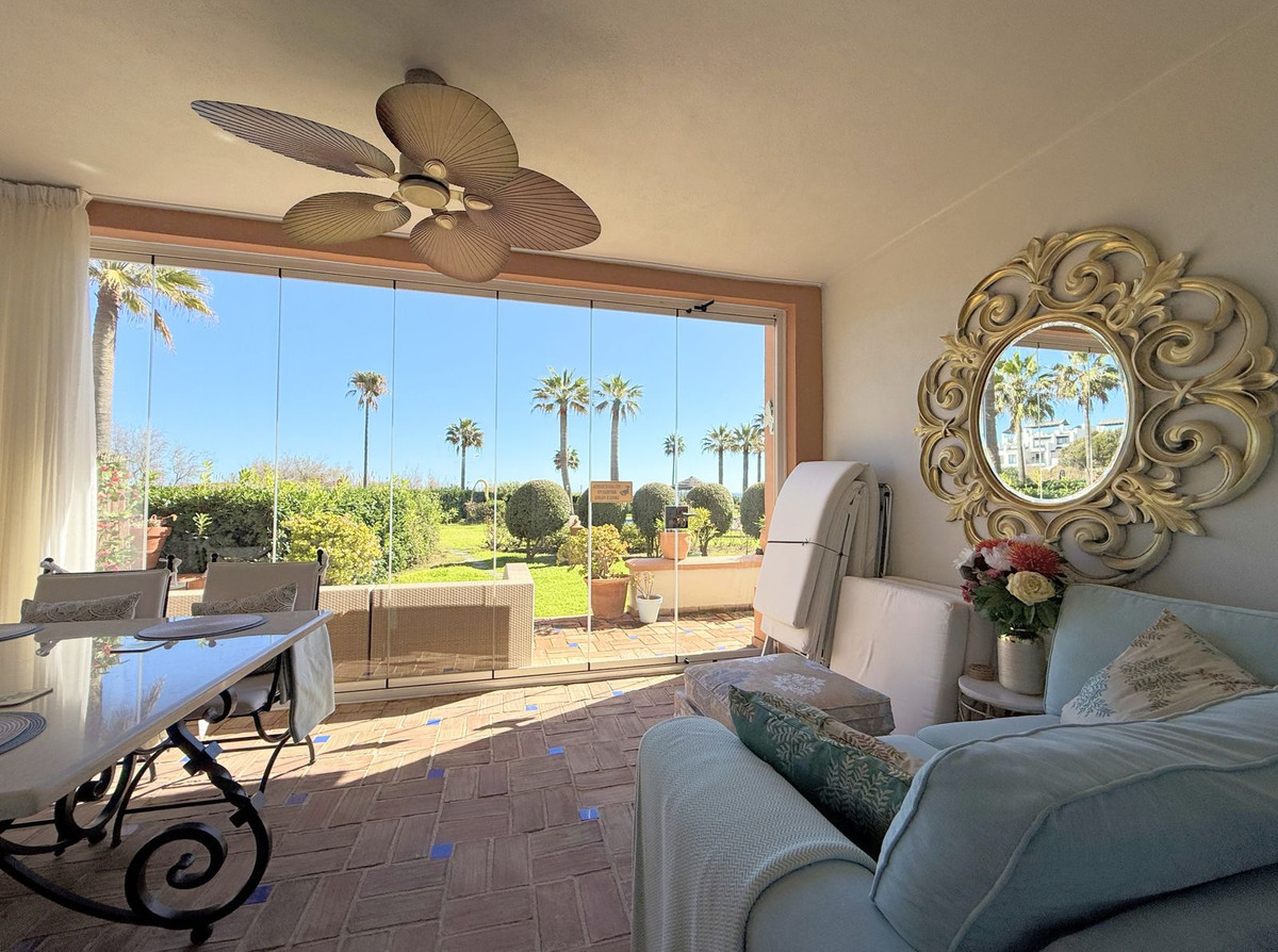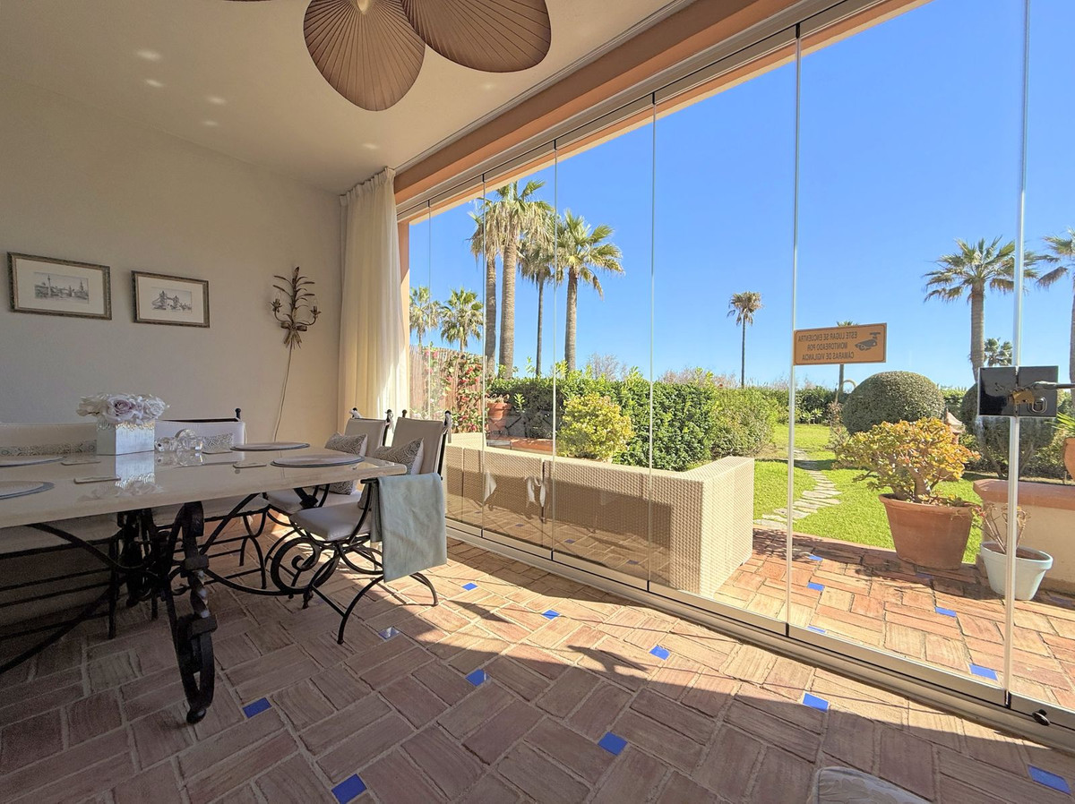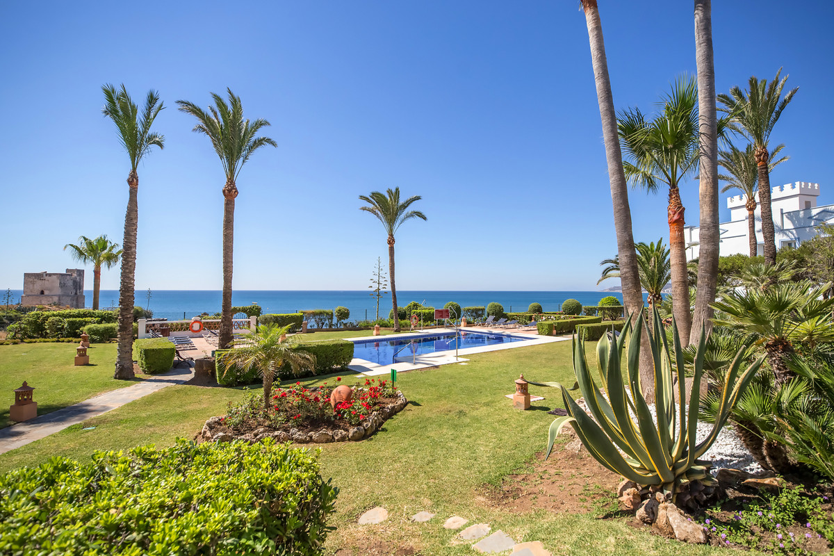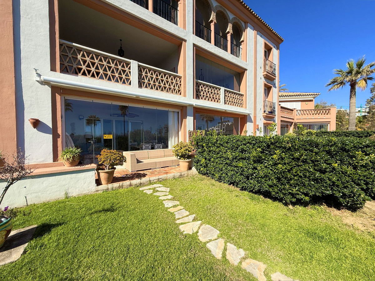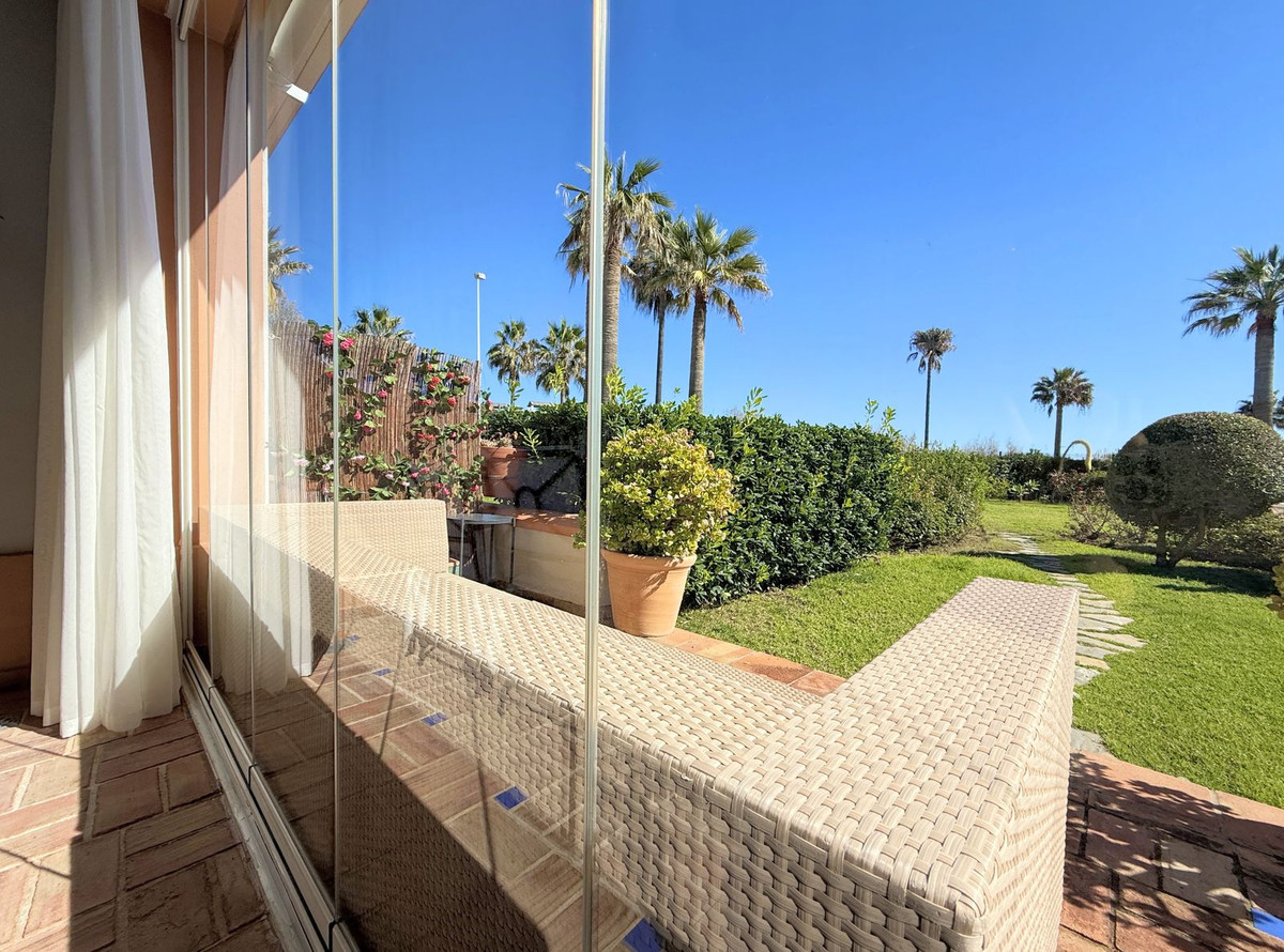 Magnificent apartment in a luxury complex on the beachfront, with a terrace and private garden, located in Casares Playa, within a prestigious development featuring a charming Moorish design inspired by the essence of Al-Andalus. Enjoy direct access to the promenade and the stunning local beaches, with a wide selection of restaurants, beach bars, and leisure areas. Situated in a privileged location between Estepona and Puerto de la Duquesa, just a five-minute drive from both, it offers the perfect combination of exclusivity, comfort, and Mediterranean lifestyle. Its south-facing orientation ensures abundant natural light throughout the day, creating a warm and welcoming atmosphere in every room. Recently renovated, the property stands out for its careful decoration and excellent condition, ready to move in. The kitchen, updated in 2023, features Siemens appliances, ivory-colored marble floors, and all windows fitted with mosquito screens. The apartment is all on one level, with two spacious and bright bedrooms designed for maximum comfort and rest. A cozy living-dining area with a fireplace opens onto the enclosed glass terrace overlooking the garden, the communal pool, and the beach. The development offers 24-hour security, ensuring peace of mind and privacy, as well as exclusive amenities such as two magnificent pools, one of them heated, allowing year-round enjoyment. The property also includes 2 underground parking spaces and 2 storage rooms, providing convenience and extra storage. Its strategic location makes it ideal as a permanent residence or an investment, with high potential for both holiday and long-term rentals. Close to prestigious golf courses, such as Finca Cortesín, as well as marinas, restaurants, and all necessary services, this property represents a unique opportunity. If you are looking for an exclusive apartment on the beachfront, with all the comforts in one of the most sought-after areas of the coast, don’t miss this opportunity.