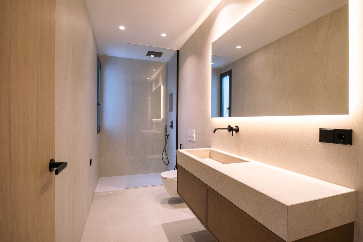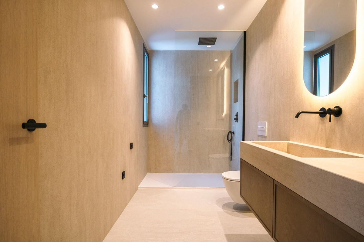 This Brand new exclusive contemporary villa on Arena Beach offers a modern, light-filled living experience. The spacious layout includes four bedrooms, each featuring state-of-the-art en suite bathrooms and handmade wardrobes with integrated lighting. The fantastic living area boasts large windows and direct access to the pool and beautiful private garden, while the high-quality American kitchen is equipped with Siemens appliances. Practical luxury is ensured by separately adjustable underfloor heating and air conditioning throughout the house. Adding to its appeal, the basement presents versatile rooms perfect for a games room, spa, or home cinema.