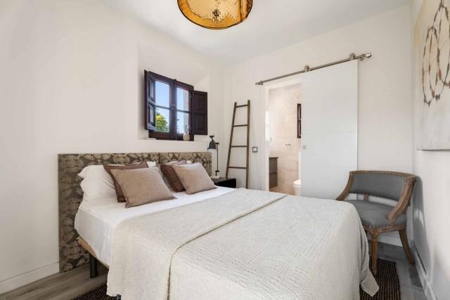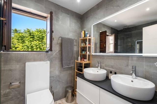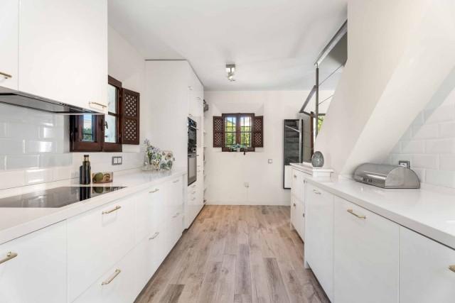 The home has been thoughtfully updated, blending Andalusian charm with modern comfort. The ground floor offers an open-plan living and dining area with a fireplace and direct access to a private terrace framed by Mediterranean greenery. A refurbished kitchen with contemporary finishes connects seamlessly to the living space, creating a functional and inviting layout.