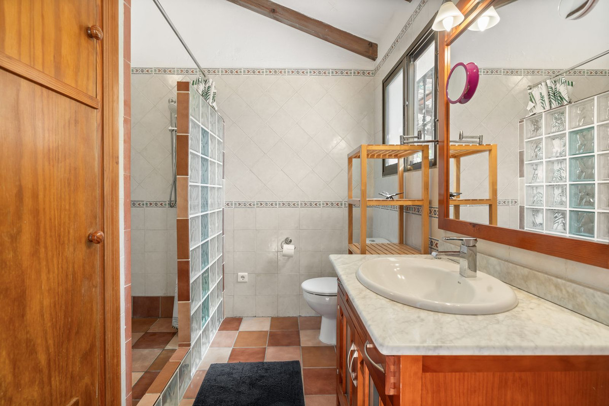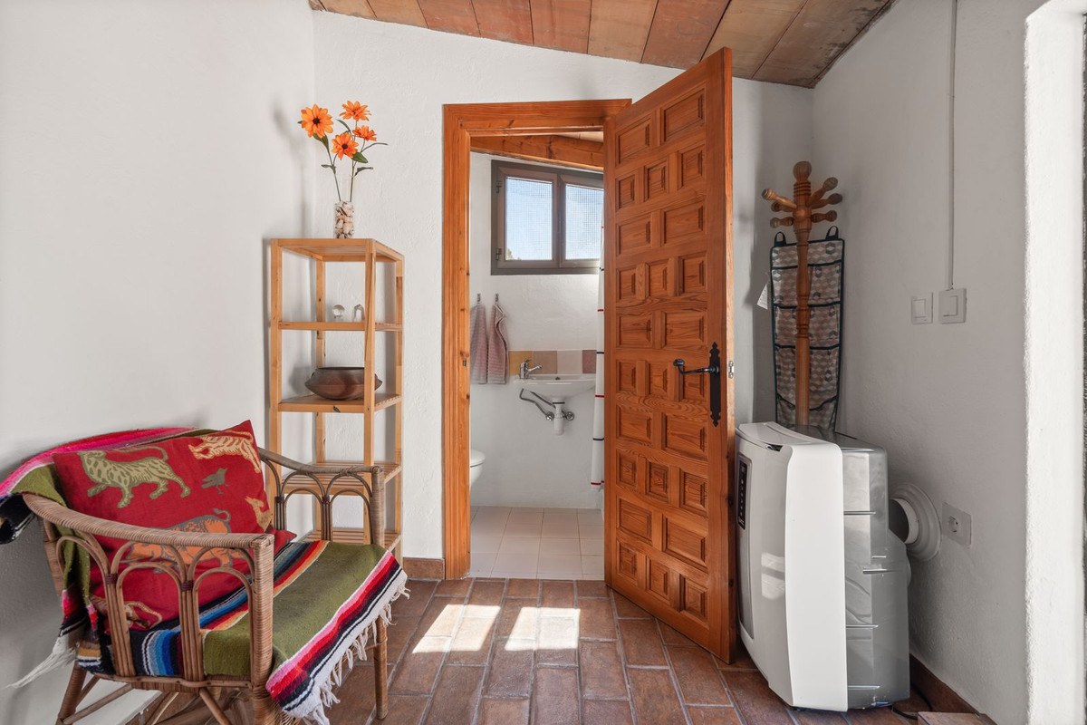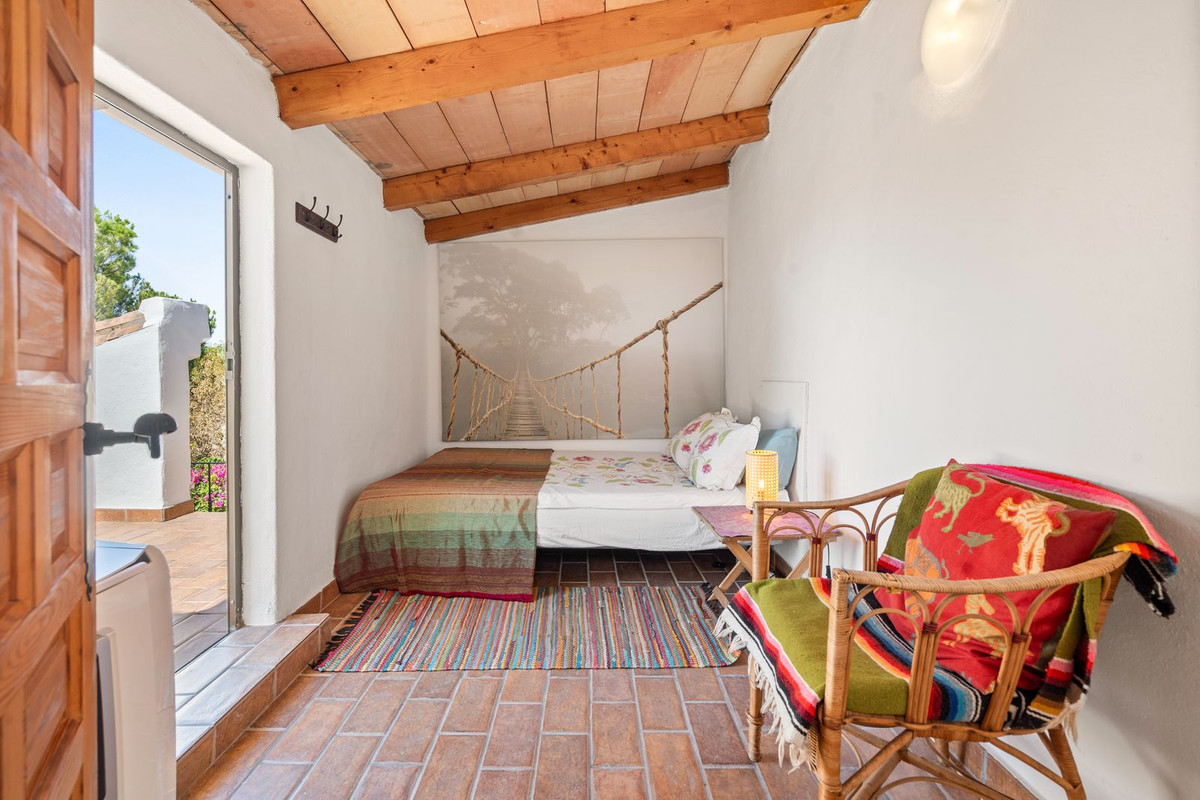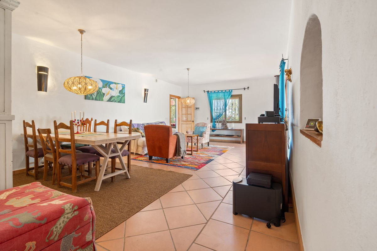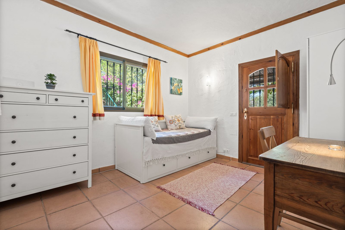 This single-level villa has a practical, flowing layout yet showcases the authentic charm of a country retreat. Details such as vaulted and beamed ceilings, rustic stonework, and decorative wrought iron add warmth and personality. A separate guest suite, accessed via an exterior staircase from the patio, provides privacy for visitors. The elegant driveway, olive trees, water features, and orchard create the feel of a miniature finca.