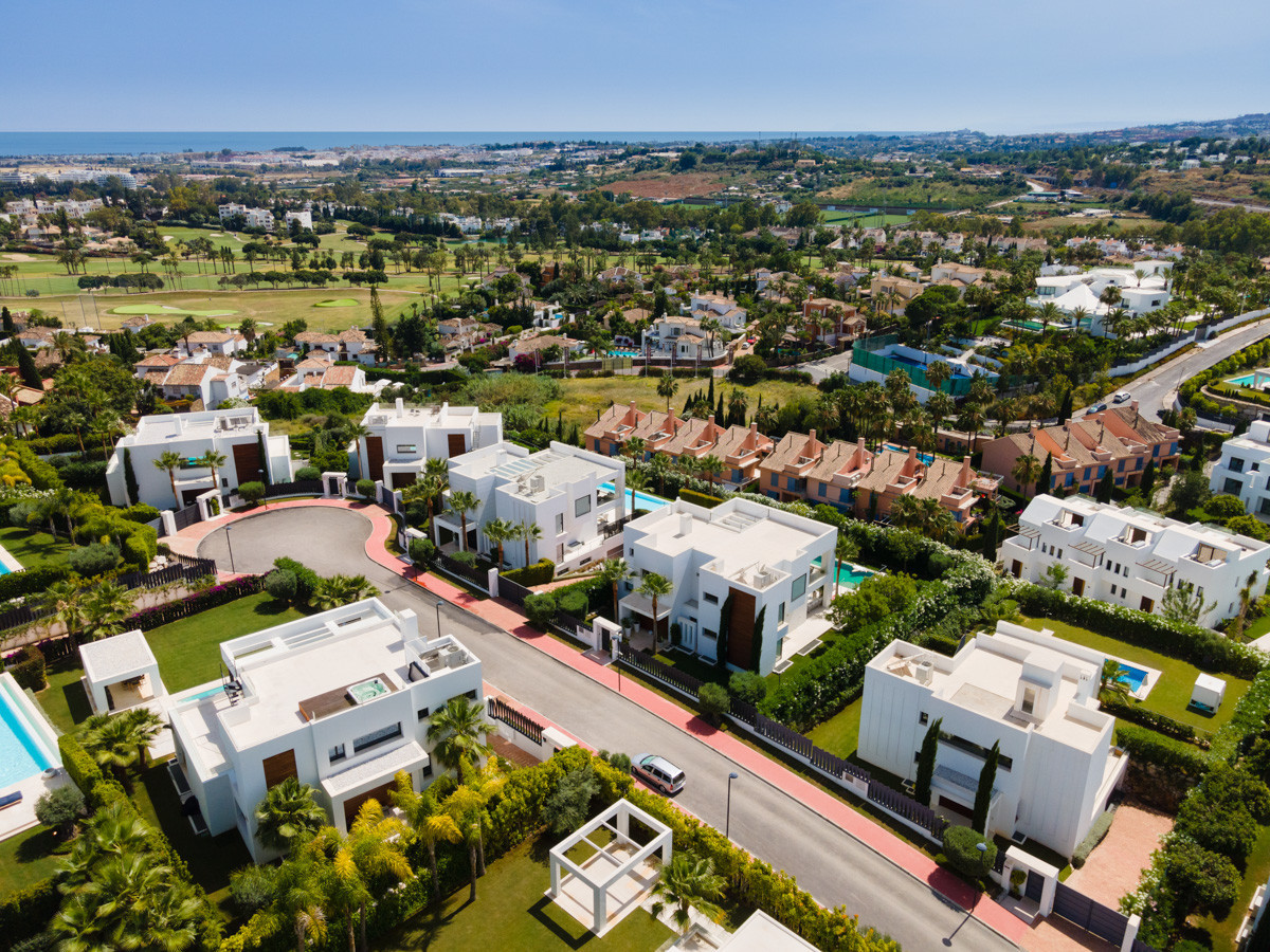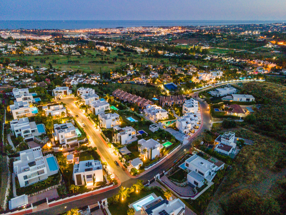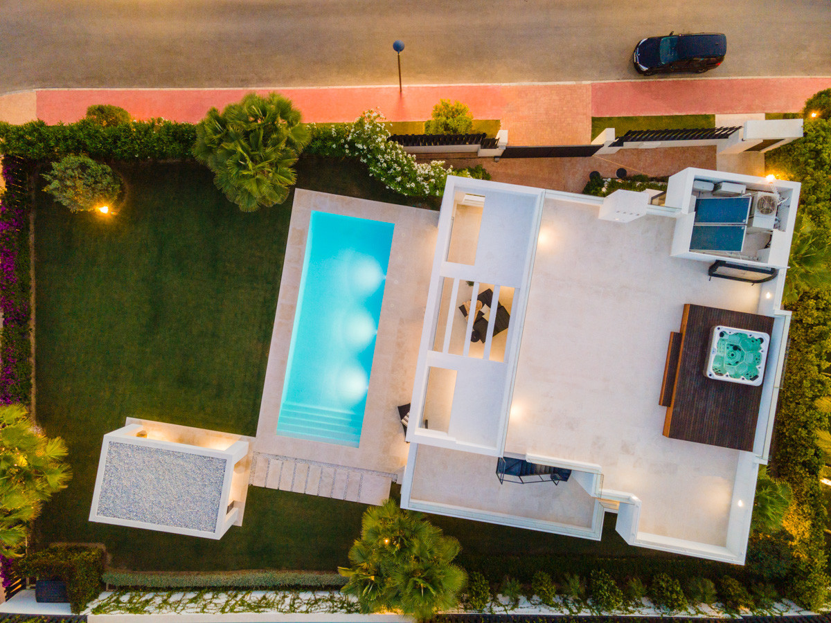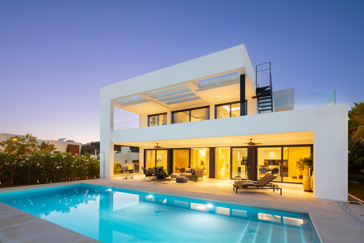 Brand-new contemporary luxury villa in a prestigious location in the famous Golf Valley, with the spectacular backdrop of Marbella’s iconic La Concha Mountain. Recently built to top specifications and finishes, this 6-bedroom villa pays special attention to the Andalusian climate, with plenty of outside seating areas carefully shaded and perfect for relaxing. Distributed on three levels, it comprises, on the main floor: spacious living room with several seating areas; open-plan fully fitted kitchen/dining area equipped with top appliances and with a central island and wine cooler; en-suite guest bedroom; access to the porches, terraces, swimming pool and the carefully landscaped garden with mature plants that surround the property create privacy from nearby homes. Upstairs: two guest en-suite bedrooms with fabulous views over the Golf Valley; stunning master suite with dressing room and a wrap-around terrace also enjoying the amazing views. Lower level: further guest bedroom with en-suite bathroom; garage for 2 cars. Possibility to add a gym on this level. Carport for 2 cars. Special features include underfloor heating in the bathrooms and home automation system throughout. Just minutes away from several international schools, world class golf courses, gastronomic experiences and amenities, this magnificent home is set within a quiet gated complex with 24-hour security, guaranteeing a total privacy.