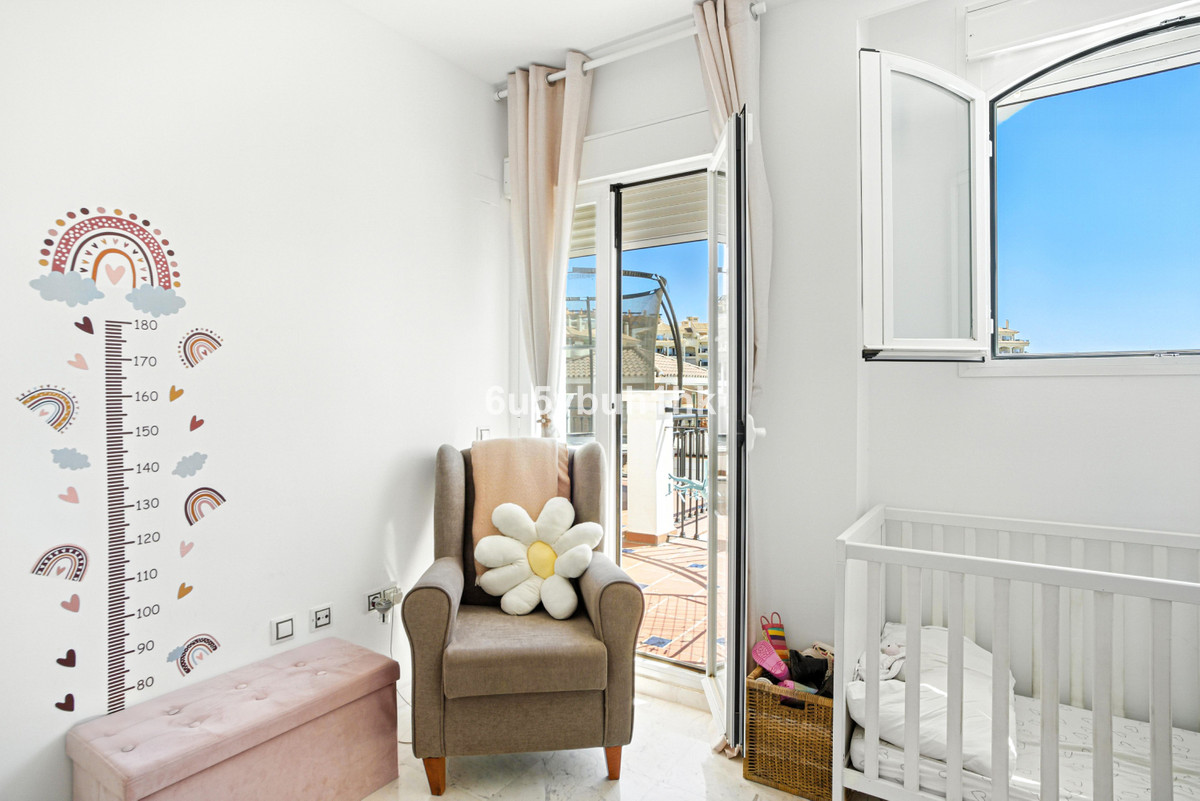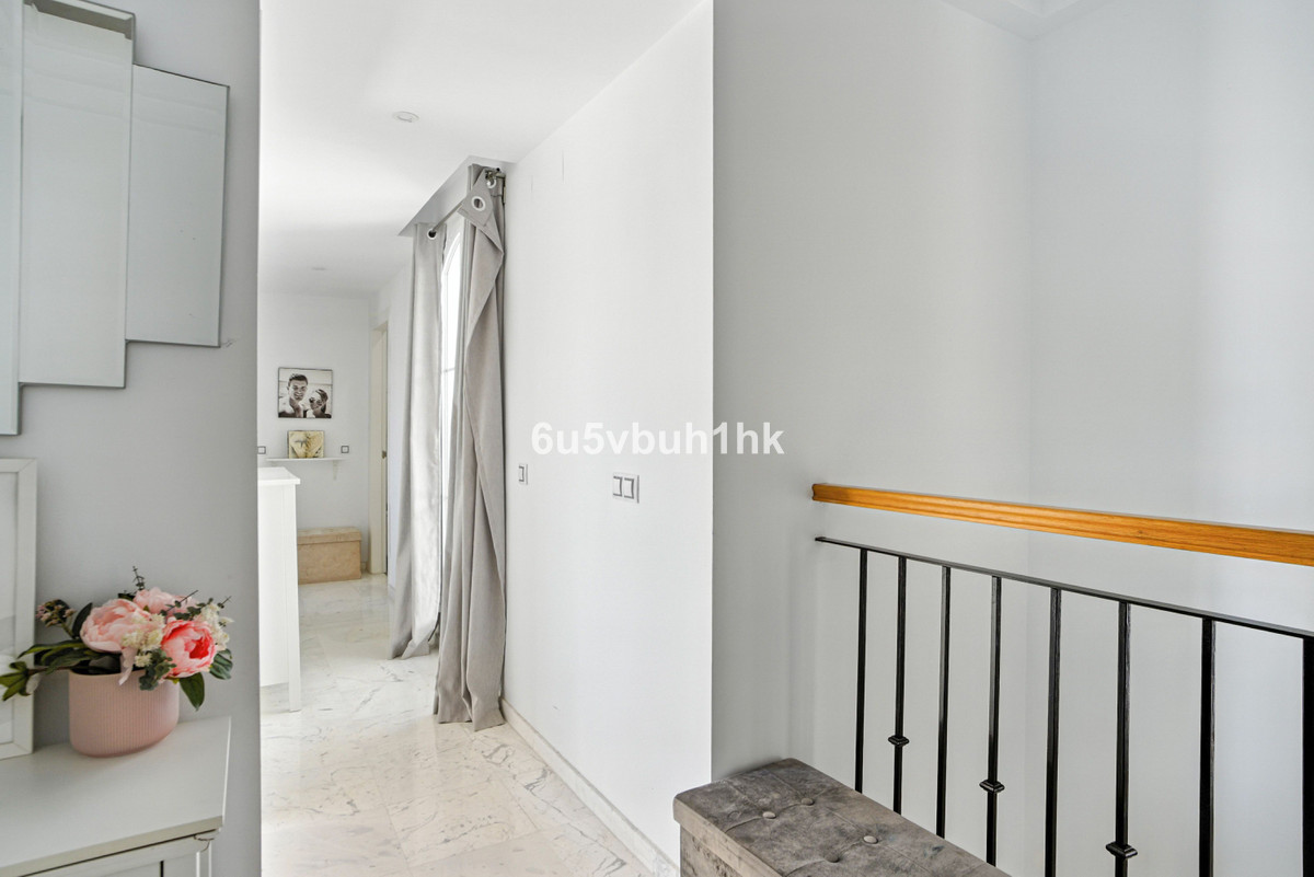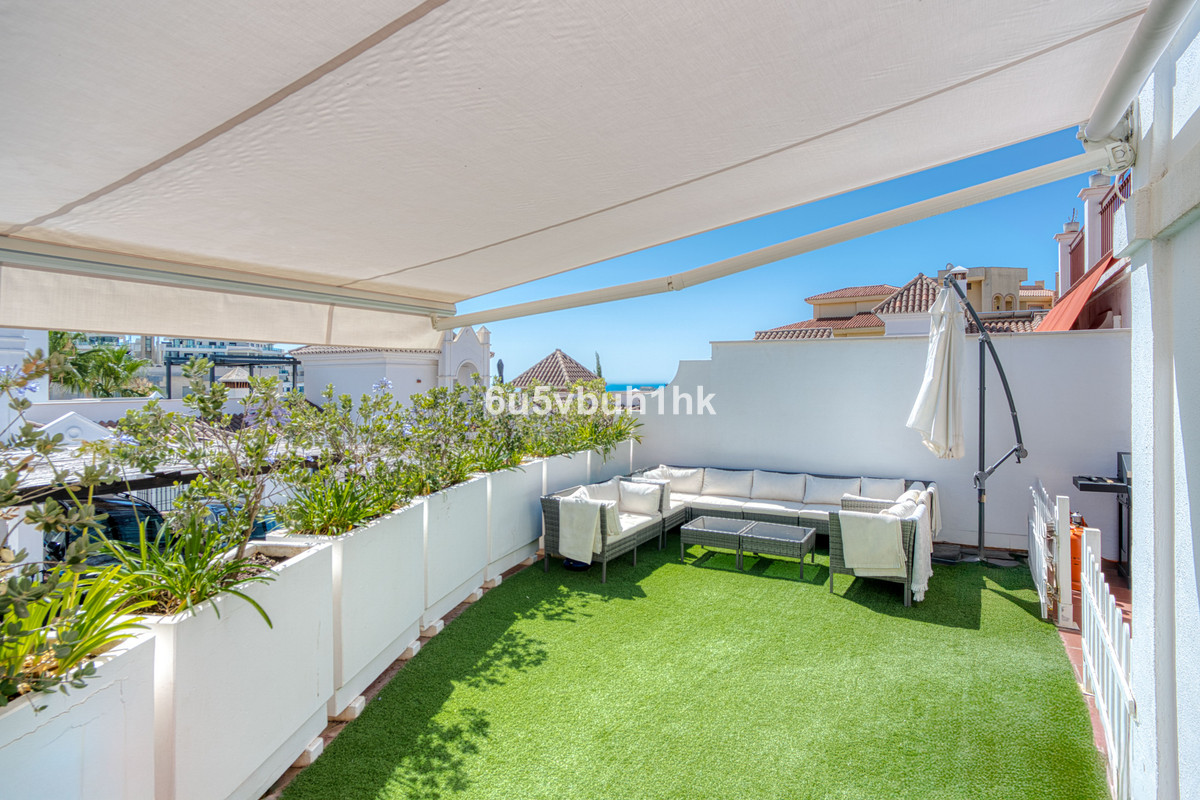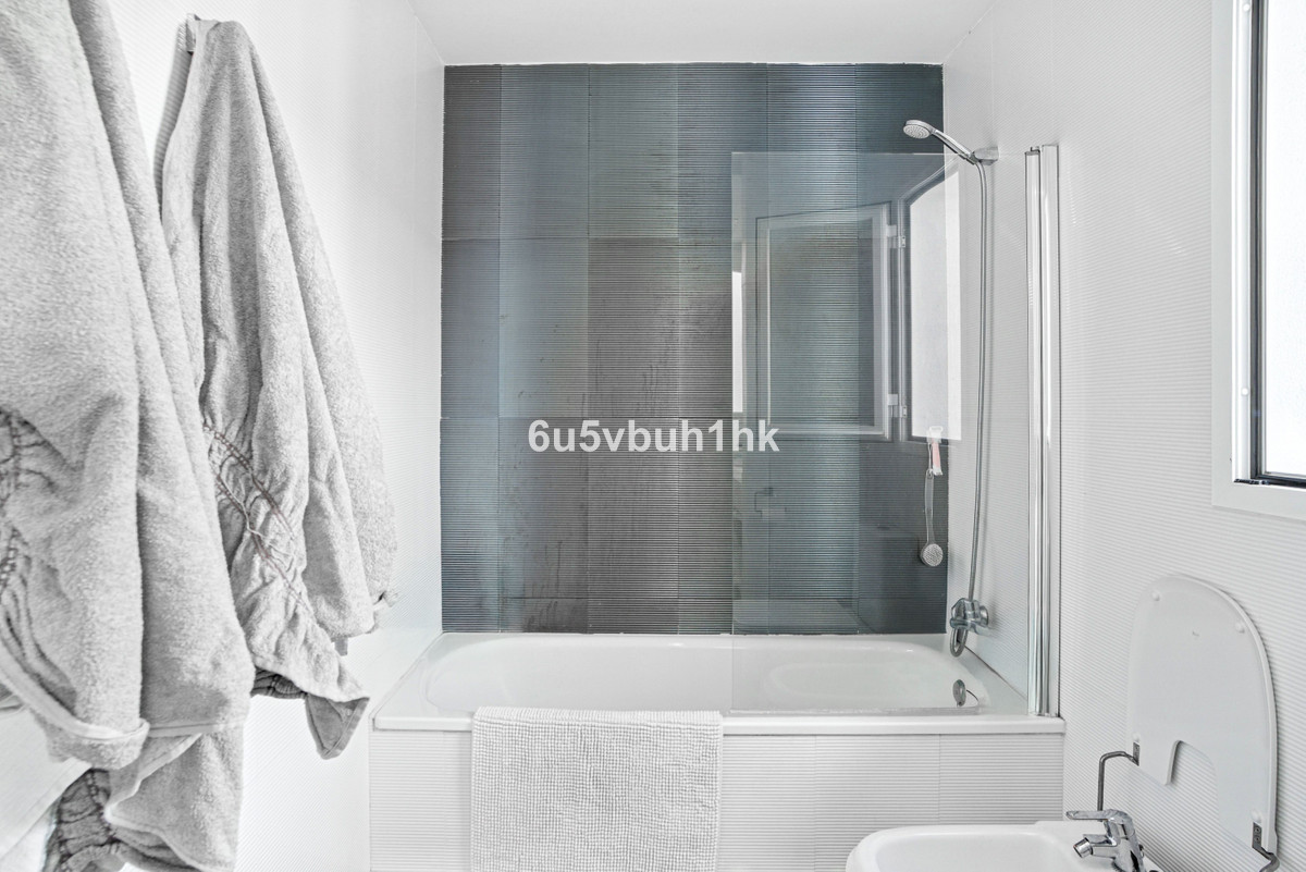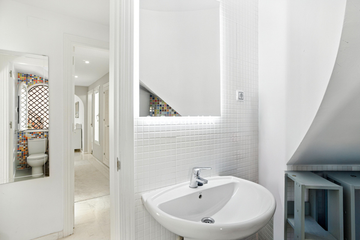 On the main floor, there is a guest toilet and the master bedroom with en-suite bathroom and direct access to the terrace. The upper floor features a bright landing, a full bathroom, and two bedrooms, both with access to a terrace offering partial sea views.