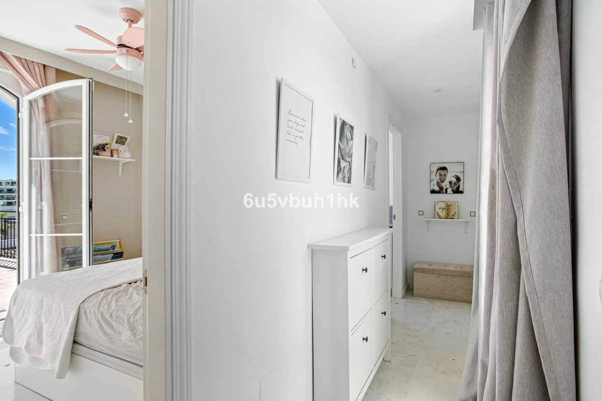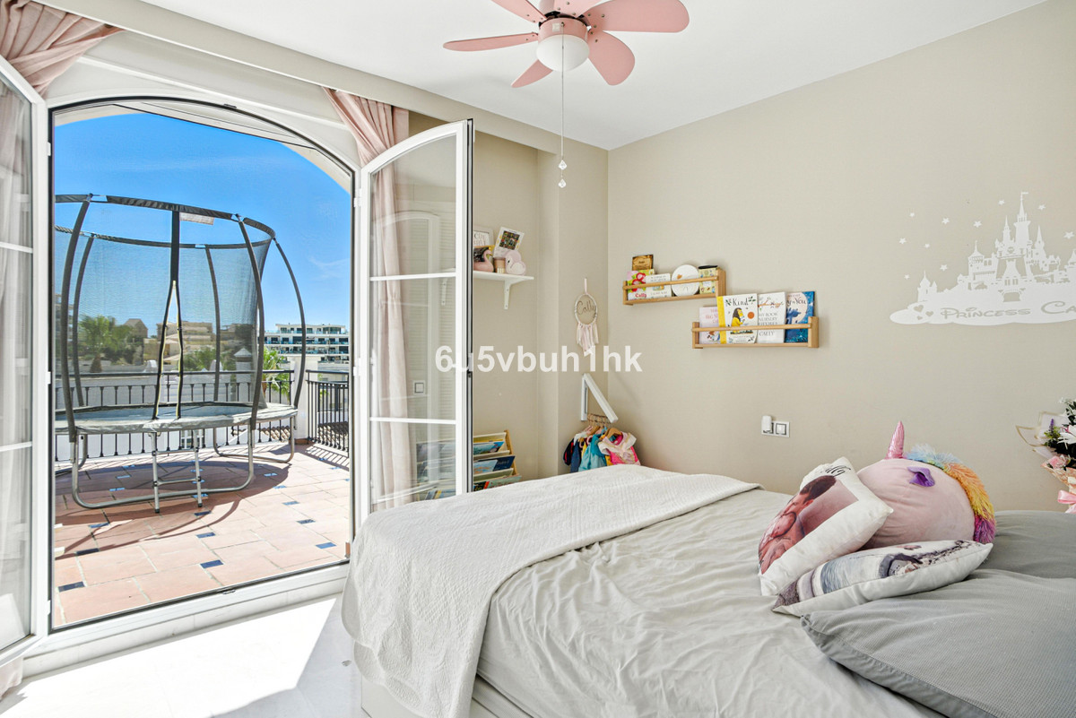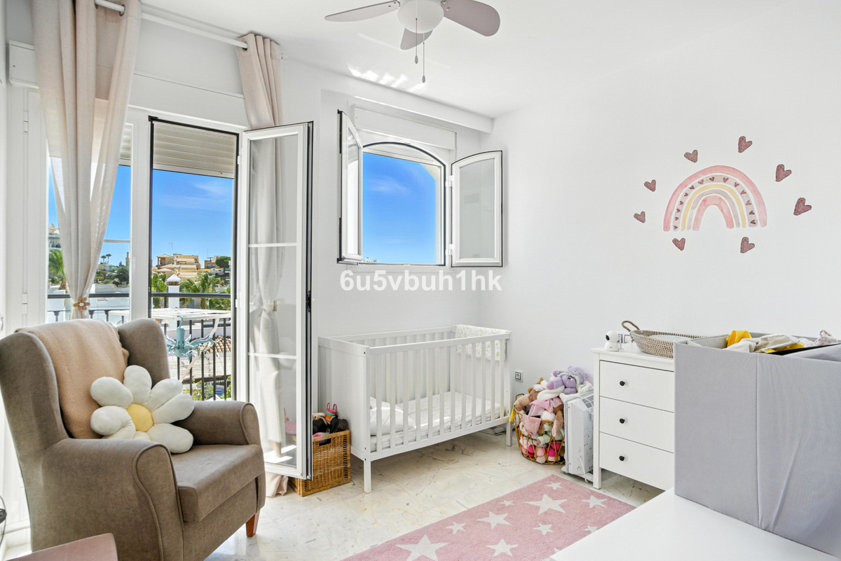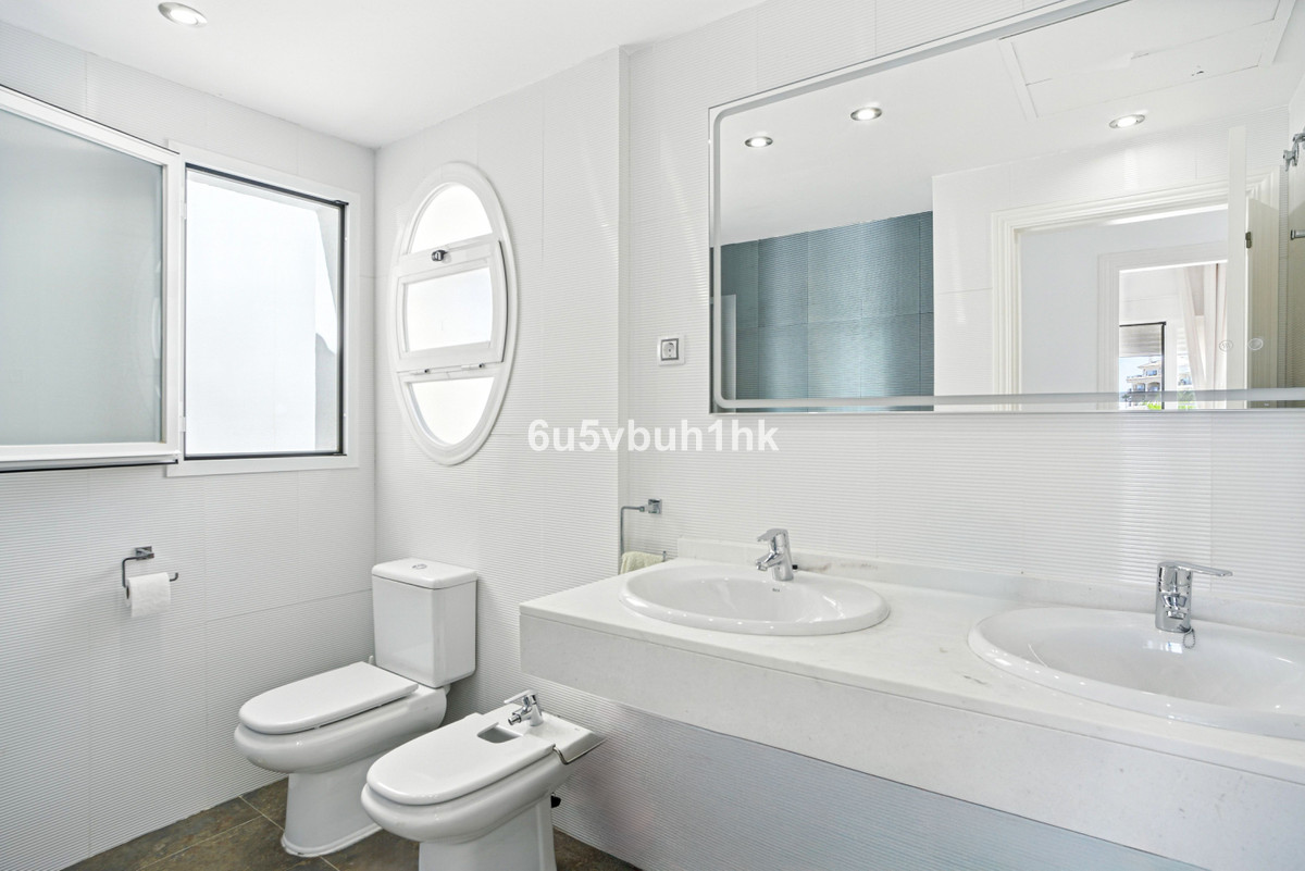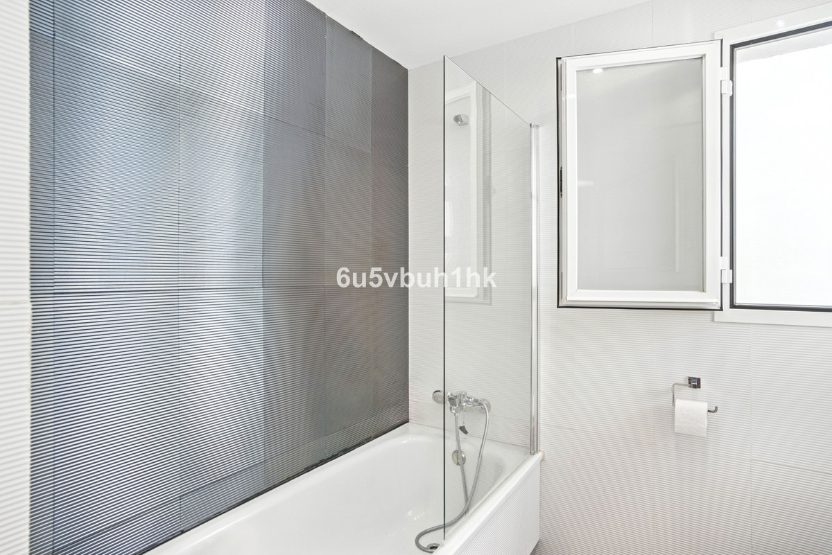 On the main floor, there is a guest toilet and the master bedroom with en-suite bathroom and direct access to the terrace. The upper floor features a bright landing, a full bathroom, and two bedrooms, both with access to a terrace offering partial sea views.