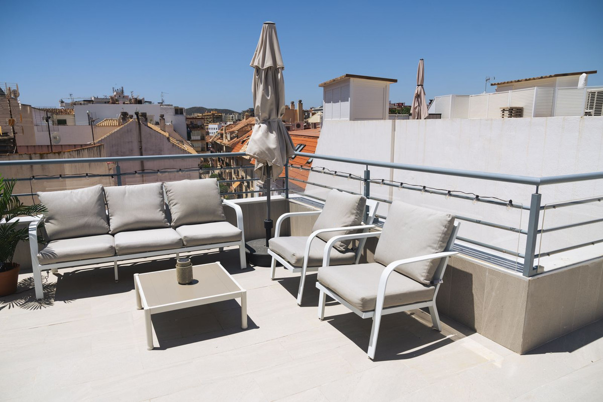 The penthouse has a south-facing balcony off the living room, perfect for your morning coffee. Upstairs, there is a large rooftop terrace of approximately 25 m², accessible via a private staircase within the apartment. The rooftop terrace is for your exclusive use, as it is accessible only through a private staircase inside the apartment. Here, you can host dinner with friends or simply relax and enjoy the view.