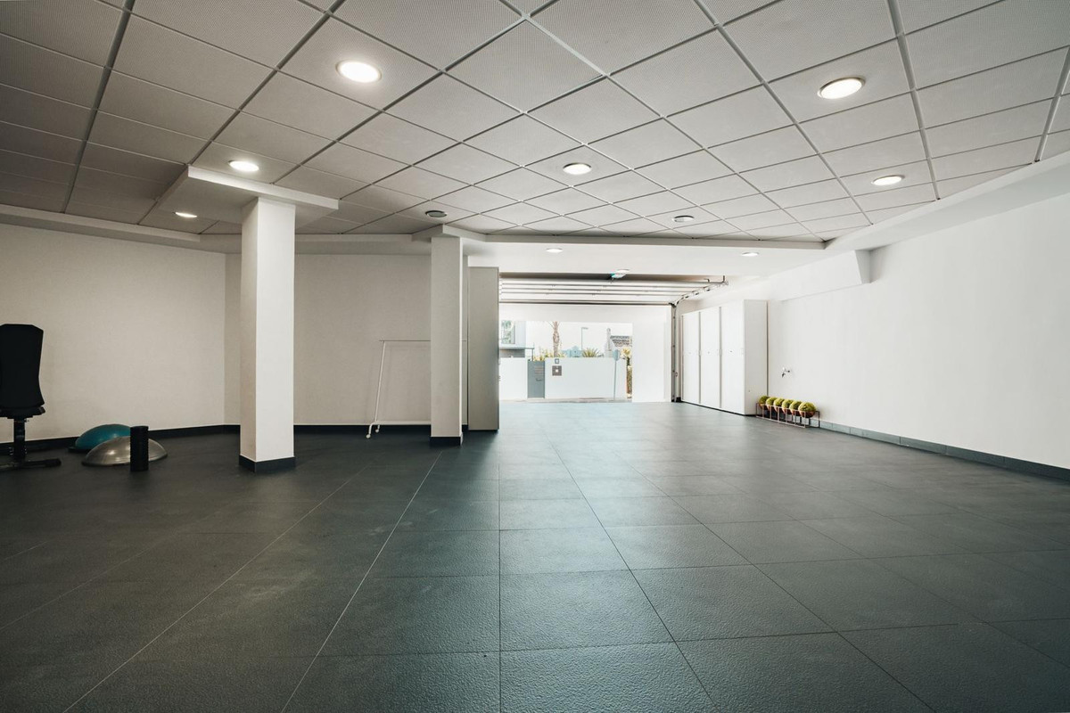 The interior comes fully furnished and features a fully fitted kitchen, a dining area, and a living room. Floor-to-ceiling windows bring in natural light while framing views of the private garden and pool. A lift connects all levels, ensuring convenience and accessibility, and a garage accommodates up to 4 cars.
