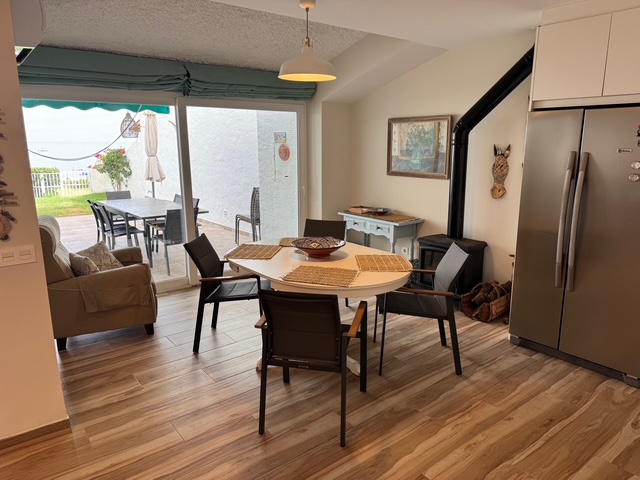 On the main living floor, you’ll find a bright open-plan cozy living and dining area with a wood-burning stove, a fully fitted open plan kitchen, and a guest bathroom. Large sliding doors lead directly to a generous terrace with BBQ area and a private garden with immediate beach access.