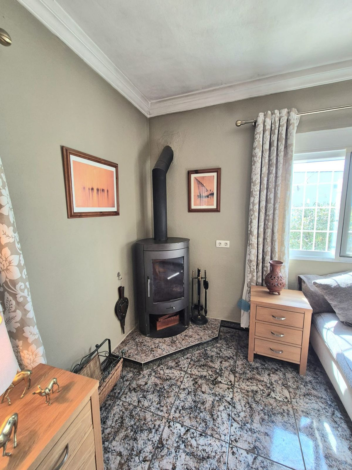 The property is located down a great tarmac road, you enter via large double gates into a large stoned area at the side of the house with plenty of parking. From here you enter the house, on the right you have a lounge with fireplace and you can access the back courtyard where you will find the laundry / pantry room. Back into the living room you have the fully fitted kitchen and a bathroom with a shower. Back into the front hallway you have to the left a double bedroom, a bathroom with a nice soaker tub, the master bedroom is straight ahead with access to the back covered terrace and pool area and to the right the 3rd bedroom also with access to the same covered terrace, the current owners are using this room as a second sitting room. There is stairs around the front that leads you up to the solarium where you have fantastic panoramic mountain views.