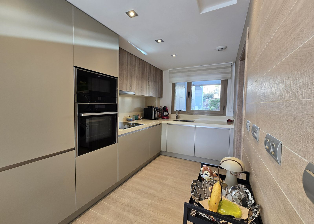 The apartment features a spacious and bright living-dining room that opens seamlessly onto the terrace, creating a perfect indoor-outdoor flow for relaxation enjoying breathtaking views over the golf course. The fully equipped kitchen, with a sleek resin worktop and adjoining laundry room, adds both style and functionality. Bedrooms are spacious with large wardrobes and equipped with tilt-and-turn aluminum double-glazed windows and electric shutters, while air conditioning (hot & cold) and energy-saving solar thermal hot water ensure modern comfort.