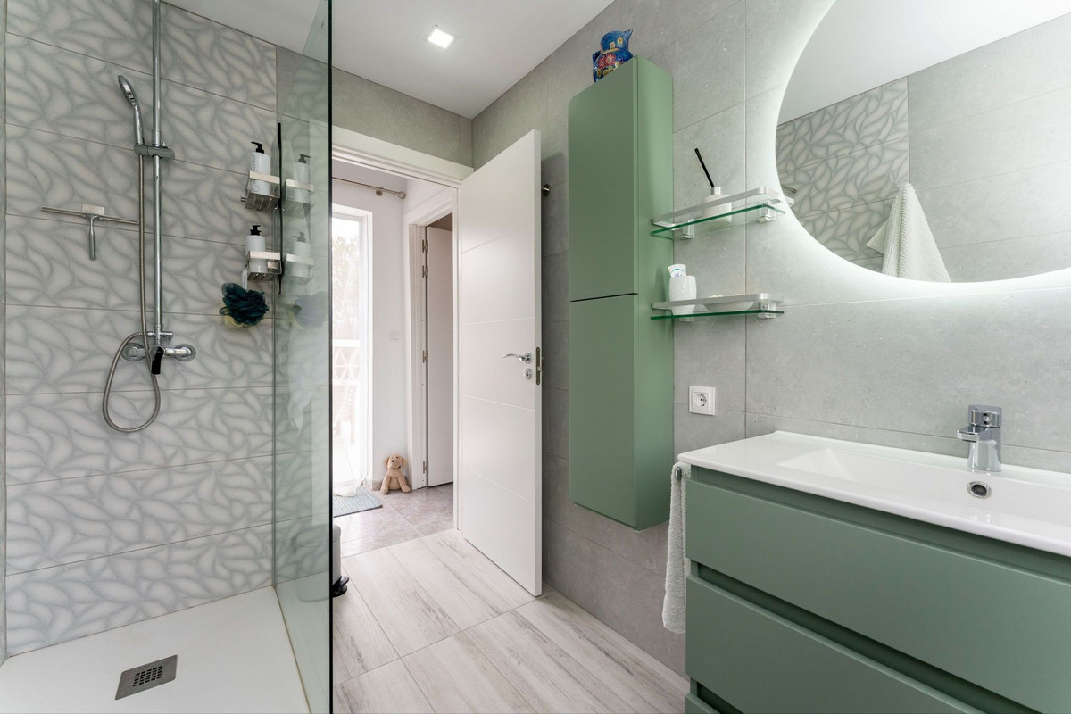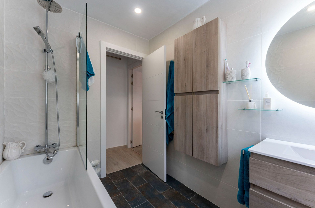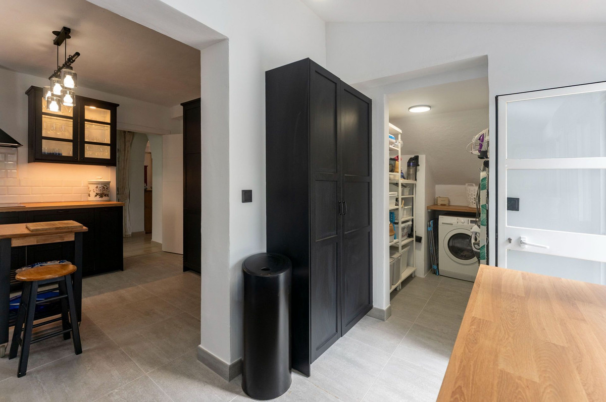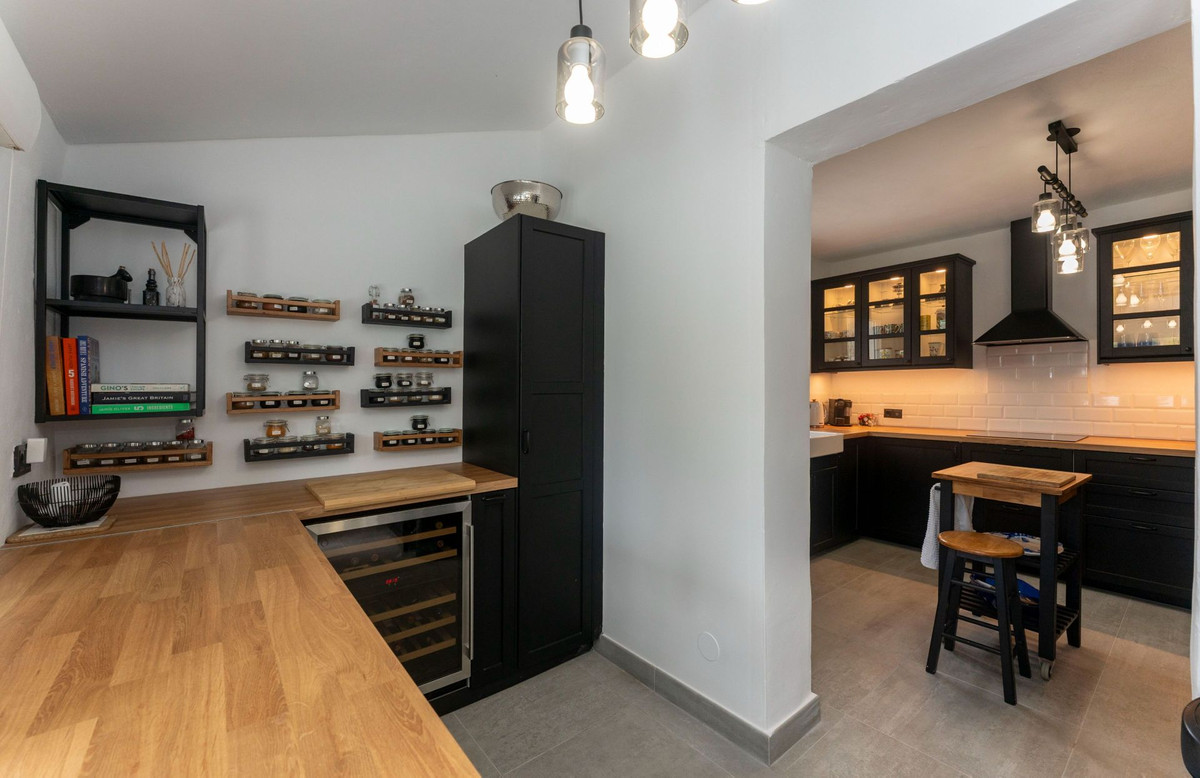 The ground floor features a spacious covered front terrace, perfect for year-round use, which leads into a bright and airy living-dining area. From here, an archway opens to a double bedroom with ample wardrobe space, a fully fitted bathroom with bathtub, and a spacious kitchen complete with a separate utility room. The utility area offers extra storage and direct access to the pool and outdoor summer kitchen, creating a seamless flow for outdoor entertaining.