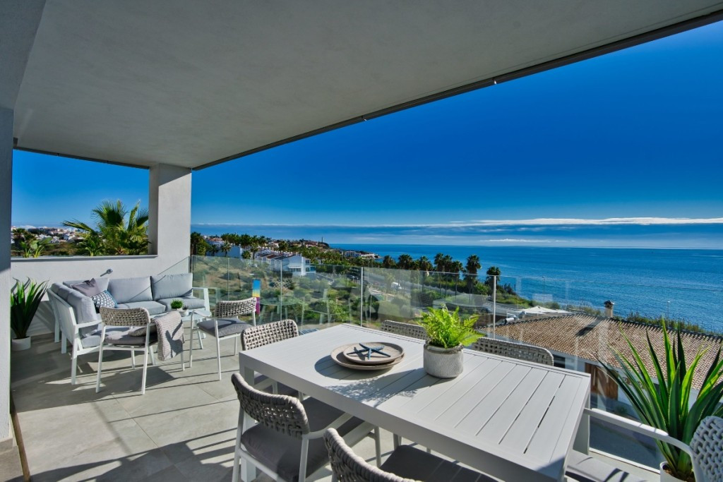 Located only a few hundred meters from the Mediterranean Sea in Mijas Costa. These modern and spacious apartments and penthouses are located in a quiet and beautifully maintained urbanization, yet close to all amenities. From the living room you have access via sliding doors to the very large terrace facing south with panoramic views over the communal gardens, the pool, mountains and the sea. The main bedroom with fitted wardrobes has an ensuite bathroom with bath and separate shower. The complex is gated and has 24 hour security. There is a private garage space in the underground garage with lifts to all levels