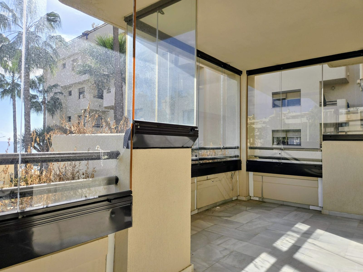 Set on the middle floor, the apartment features approximately 60 m² of built area plus an 10 m² private double-width terrace, accessed from both the living room and bedroom. Fully enclosed with retractable glass curtains, the space can be enjoyed all year round—whether for morning coffee with sea views or relaxing evenings overlooking the gardens and beach.. The layout includes a double bedroom with fitted wardrobes, a full bathroom, a fully fitted kitchen and a comfortable living area opening onto the terrace—ideal for relaxing or dining outdoors.