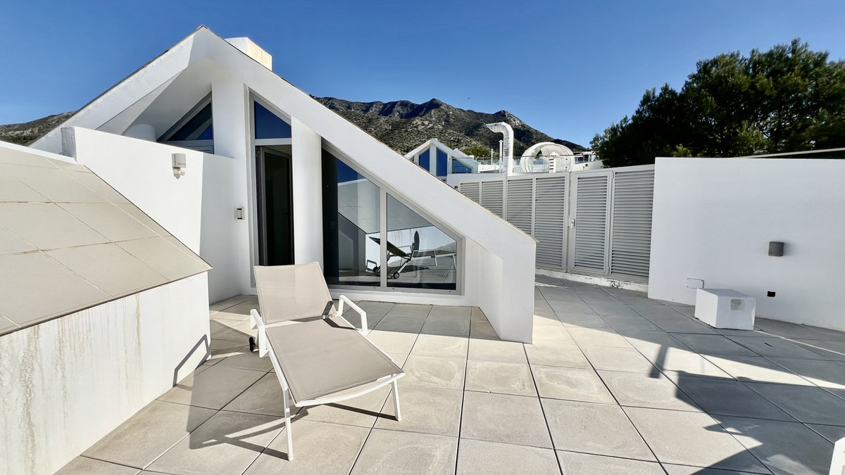 Residents will enjoy a wealth of amenities, including a private garden, a communal pool, a private garage, and a solarium. The property also benefits from a covered and private terrace, balcony, and barbecue area, perfect for entertaining while taking in the panoramic sea, mountain, and garden views. Security is paramount, with a gated community, security entrance, 24-hour security service, and an advanced alarm system.