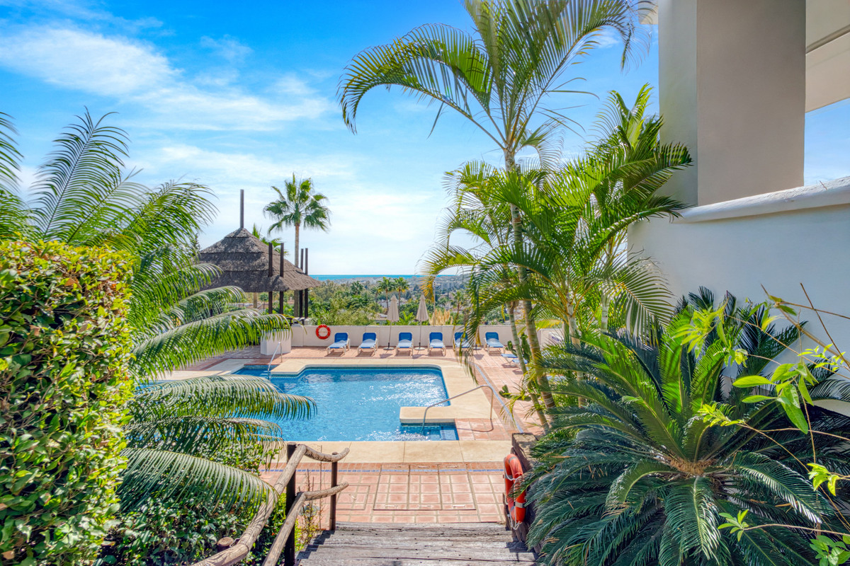 Wonderful two-bedroom, first floor apartment located in the sought-after gated community of Las Tortugas, Nueva Andalucía. Recently renovated and beautifully decorated, this property offers a perfect combination of Andalusian charm and modern comfort. The community boasts a large communal swimming pool surrounded by landscaped gardens with stunning sea views. Located in a tranquil and private setting in the heart of Nueva Andalucía, it is just a short drive to shops, restaurants, international schools, and Puerto Banús. The complex is also surrounded by several renowned golf courses, making it ideal for golf enthusiasts. The property has an open plan living and dining area with access to a spacious south-facing terrace; fully fitted kitchen; master suite with terrace access; guest bedroom; and guest bathroom. Other features include hot and cold air conditioning, marble floors, fitted wardrobes, a private parking space, and a storeroom.
