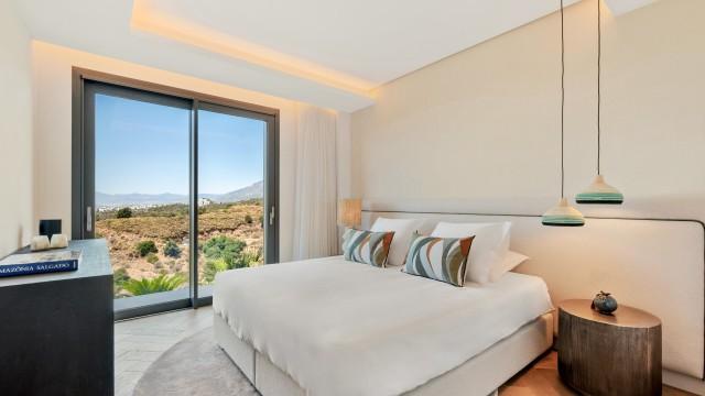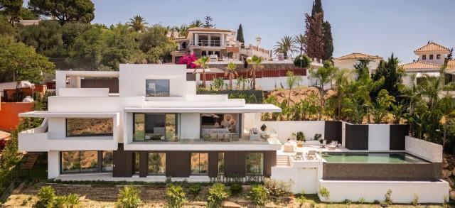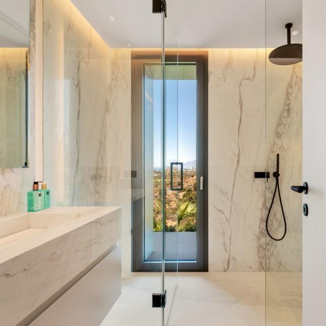 Inside, the villa is finished to a high standard with elegant stone surfaces, warm wood cabinetry and discreet lighting. Generous bedrooms include stunning ensuite bathrooms, while the master suite offers direct terrace access and panoramic sea views. With its modern design, private setting and exceptional vistas, this property is a standout contemporary home in Marbella East.
