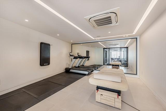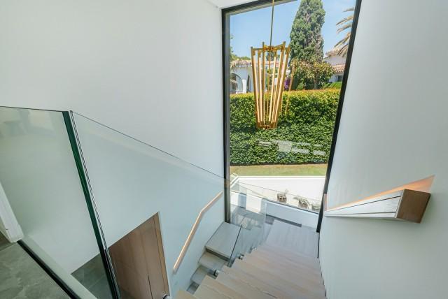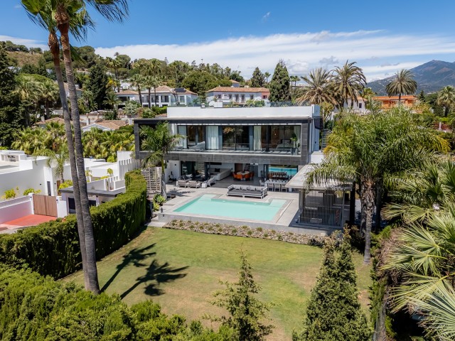 Welcome to a stunning, modern residence nestled in the heart of Las Brisas, Nueva Andalucia. This south-facing home boasts an expansive, private garden complete with generous outdoor spaces, perfect for both relaxation and entertainment. The lower floor is a haven of luxury and convenience, featuring a spacious 2-car garage, a charming bodega, a gym, a relaxing sauna, a cozy TV room, and two inviting bedrooms. Ascend to the main floor, where you'll find a sleek, open-plan kitchen outfitted with top-of-the-line Gaggenau appliances. The living area seamlessly extends to an outdoor terrace, creating an idyllic indoor-outdoor living experience. Here, you can enjoy a refreshing dip in the pool, prepare meals in the outdoor kitchen, or unwind in the chill-out area by the fireplace. The upper floor is home to the master suite and a fourth bedroom, both of which open onto a magnificent