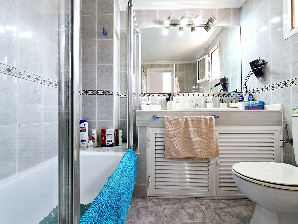 The property is accessed via an attractive Andalucian style porch with beautiful tiles and potted plants that opens up into the entrance hall with large cupboards. To the left is the fully fitted kitchen with separate utility room and guest bathroom. Down a few steps takes you into the large sitting room come dining room with a handy bar for those who like to entertain, and this leads straight out to the large terrace with beautiful Andalucian tiling and colourful plants. There is enough space on this terrace for family dining and a chill out area. A gate at the end of the terrace takes you to the communal gardens and swimming pool with direct access to the beach.