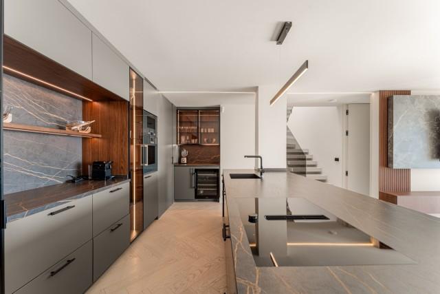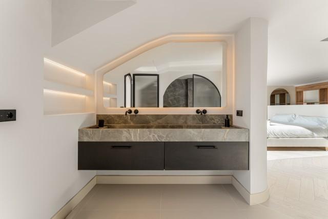This impressive duplex penthouse, located in the exclusive Monte Halcones development in La Quinta (Benahavís), combines contemporary design, Scandinavian elegance, and panoramic views of the Mediterranean Sea and mountains. Completely renovated, it offers high-quality finishes, herringbone wooden floors, custom woodwork, and large Cortizo windows that flood the spaces with natural light.