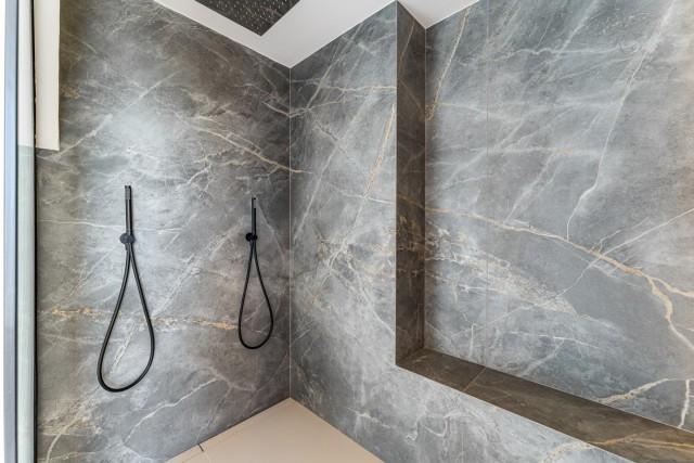 Spread over two floors, it features four bedrooms and three bathrooms, plus a guest toilet. The main floor houses three bedrooms with en-suite bathrooms and an open-plan living room connected to a state-of-the-art Gaggenau kitchen. Upstairs is the master suite, with a private terrace and Jacuzzi, offering a luxurious and private retreat.