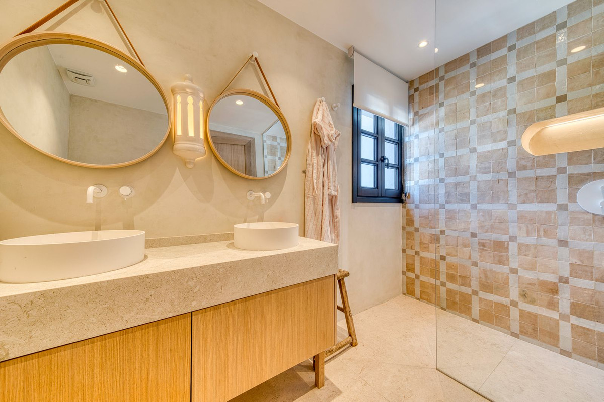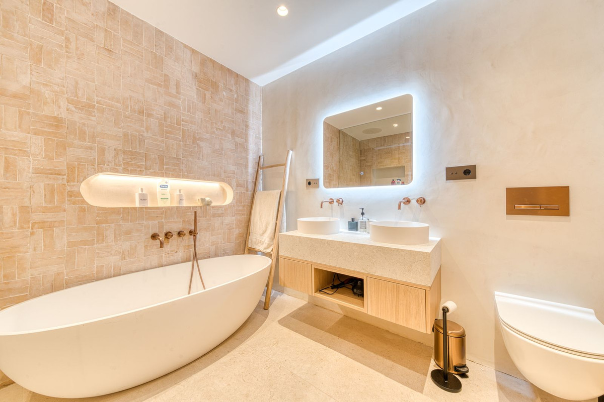 You enter this stunning home via a sun-drenched courtyard, ideal for alfresco dining, and step into a home where every detail has been carefully curated. The main floor flows beautifully, featuring a designer kitchen with Gaggenau fitted appliances, a central island, and a generous dining area. The open-plan living room is framed by limed oak ceiling beams and oversized sliding doors that lead onto a spacious terrace, flooding the space with light and connecting indoor and outdoor living. Downstairs, the lower level is all about comfort and entertainment, offering a private cinema lounge with an oversized sofa, a secondary kitchen and bar, wine display, and two beautifully appointed guest suites, each with its own bathroom and access to a covered terrace. Upstairs, the master suite is a tranquil escape with a dressing room, full en-suite bathroom, and a beautiful free standing bathtub. A fourth bedroom completes the level, ideal for family or additional guests.