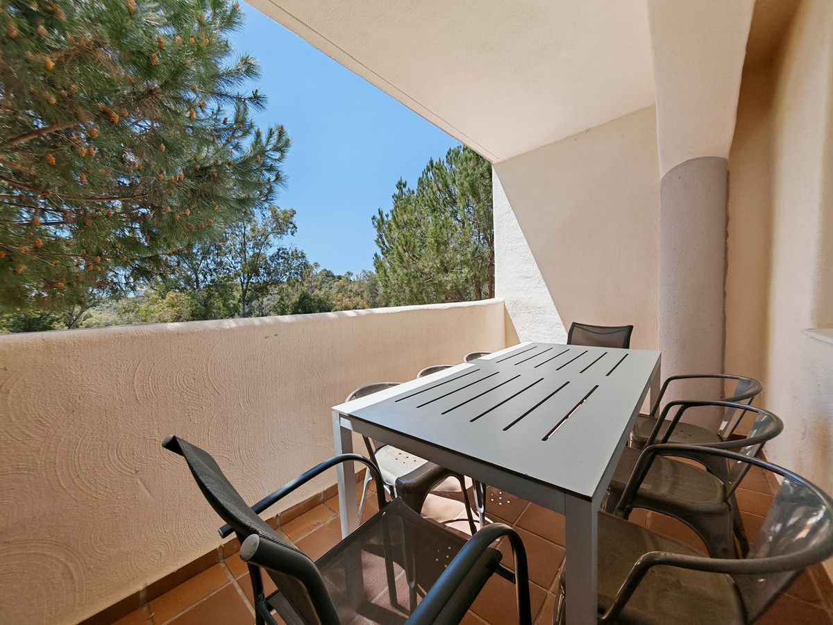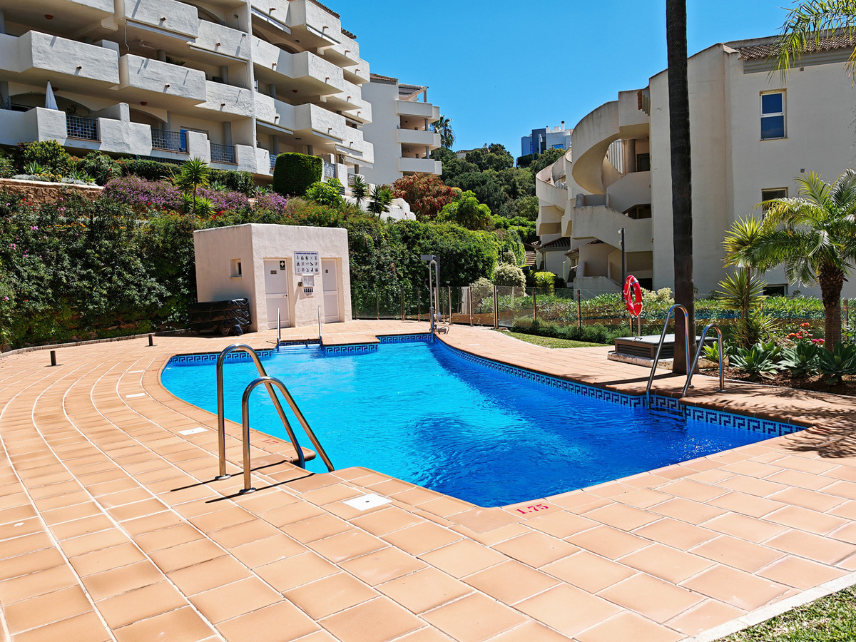 Apartment for sale in Elviria, Marbella with 2 bedrooms, 2 bathrooms, 1 on suite bathroom and with orientation south/west, with communal swimming pool, communal garage (1 parking spaces) and communal garden. Regarding property dimensions, it has 123 m² built and 16.25 m² terrace. Has the following facilities amenities near, air conditioning, fully furnished, fully fitted kitchen, marble floors, private terrace, kitchen equipped, water tank, country view, indoor pool, laundry room, internet - wi-fi, covered terrace, fitted wardrobes, gated community, lift, close to sea / beach, close to golf, balcony, excellent condition, ceiling cooling system, close to town, close to schools, surveillance cameras, inside golf resort and close to restaurants.