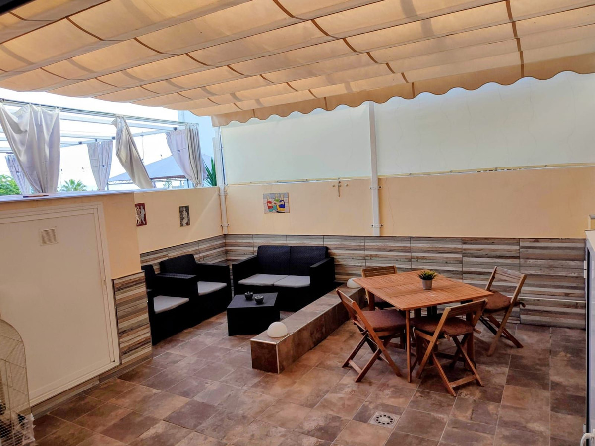 At the back, you’ll find a functional patio with a countertop (including electrical sockets for outdoor cooking), a laundry room with a Junkers butane water heater, a utility sink, and plenty of shelving.