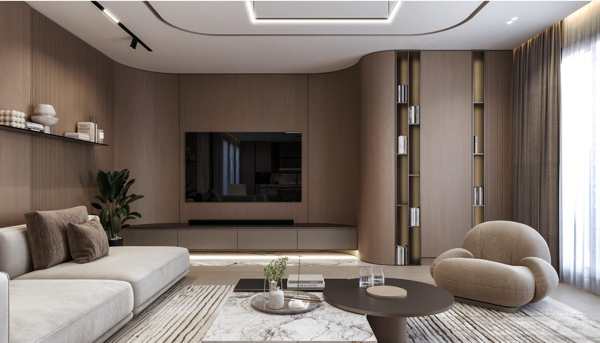 Inside, the 70 m² open-plan living, dining, and kitchen area welcomes abundant natural light, creating an atmosphere of spacious elegance. The home includes three serene bedrooms and three beautifully appointed bathrooms, with the master suite offering a designer freestanding bathtub and wall-mounted rainfall shower. Every detail reflects craftsmanship and harmony: Arklam stone countertops, a statement kitchen island, Miele premium appliances, and a built-in wine cooler complement Austrian-made furniture boards and tailor-made storage solutions. Warm Belgian flooring and Hansgrohe brushed bronze fittings add understated sophistication, while motorised curtain rails and shutters bring effortless comfort.