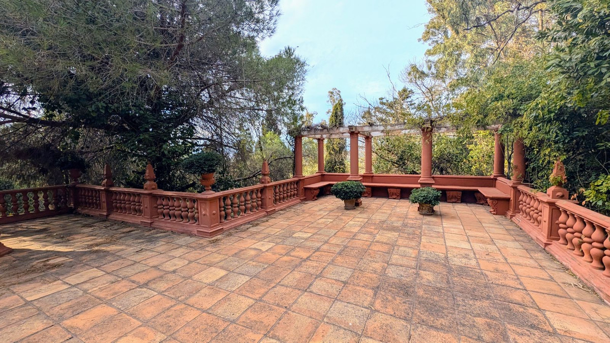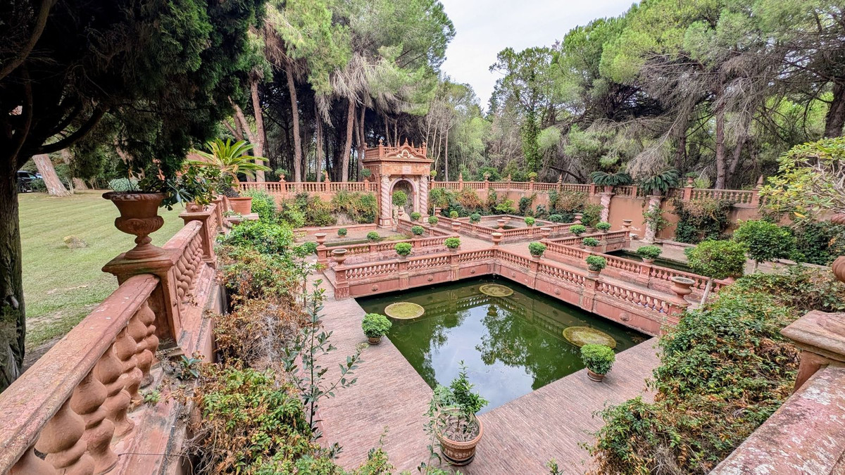 Extensive outdoor terraces with water features are connected by lush surrounding gardens and forests
