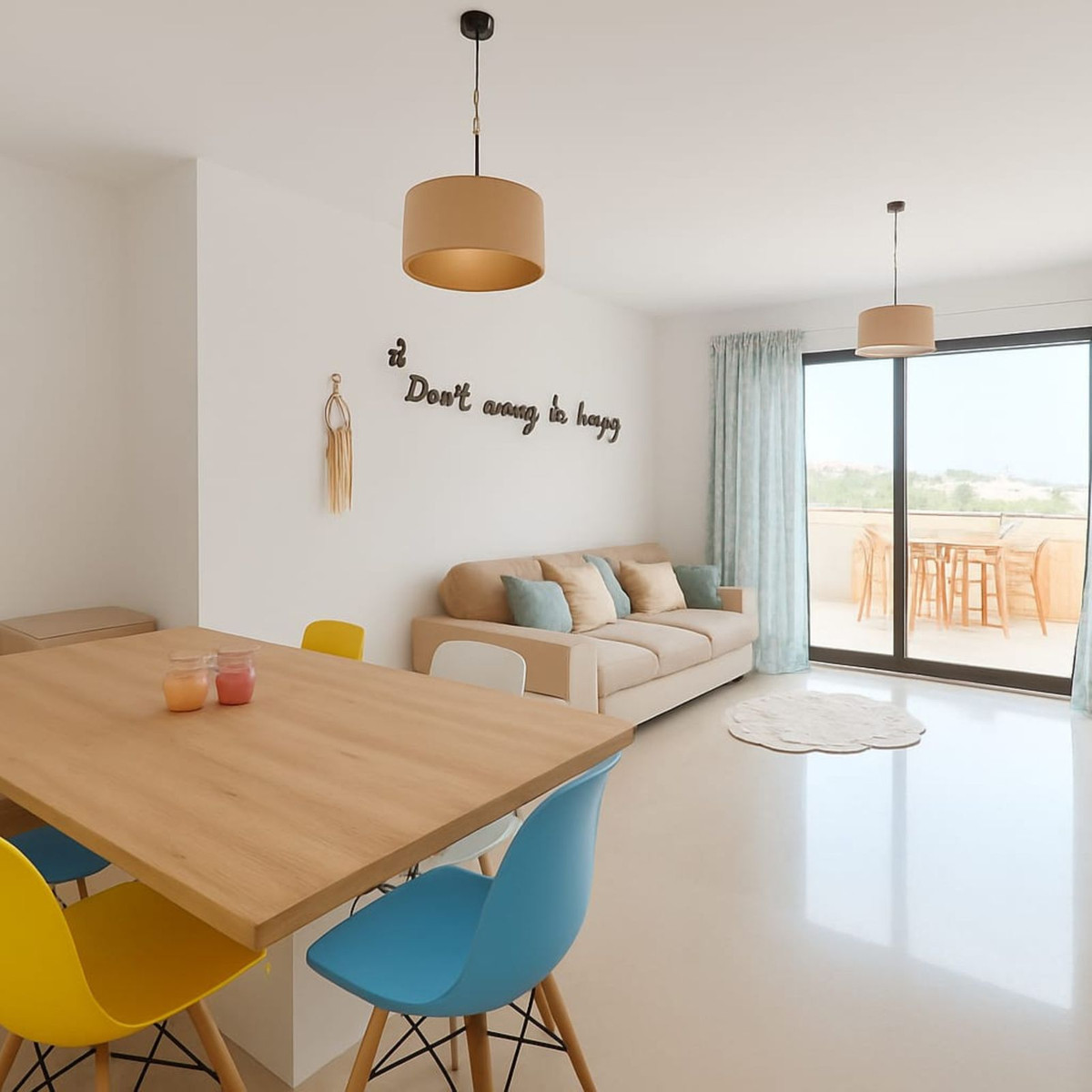 The apartment stands out for its spaciousness, natural light, and functional design, offering the perfect layout to enjoy the Mediterranean lifestyle. It features two large double bedrooms, both with direct access to terraces, two full bathrooms, a fully equipped kitchen with top-quality appliances, and a bright living and dining area with large windows that open onto a private terrace. This outdoor space is perfect for relaxing in the sun, enjoying al fresco dining, or admiring the breathtaking sunsets over the gardens and sea.