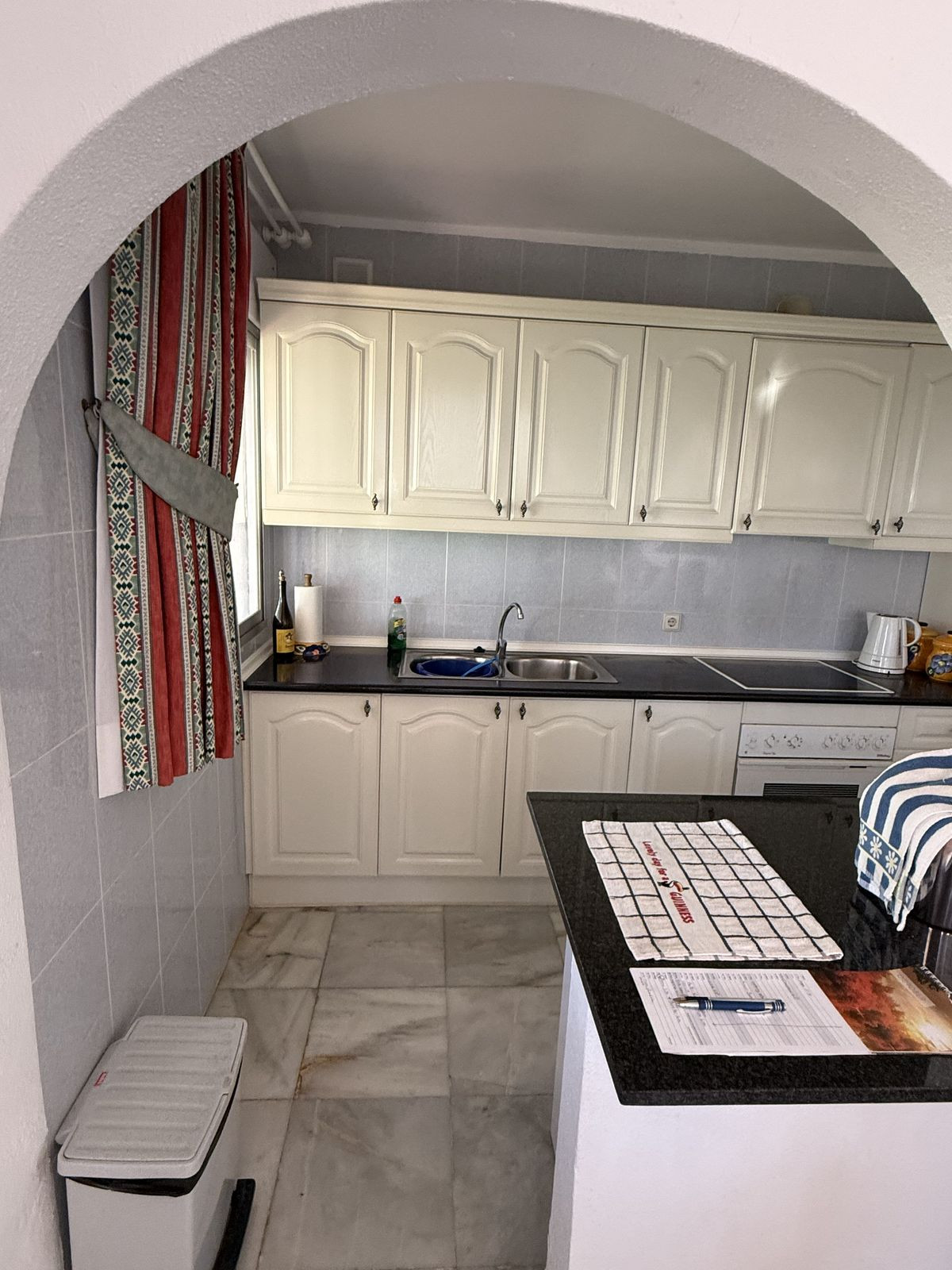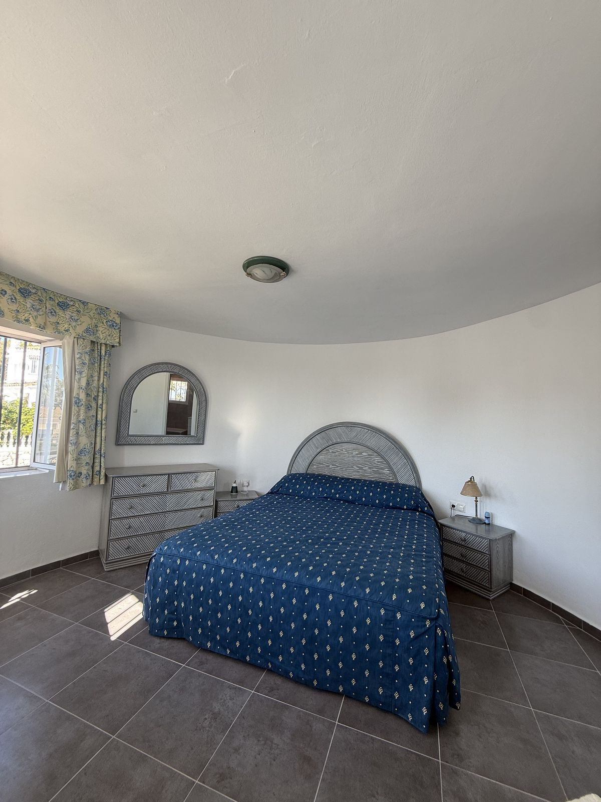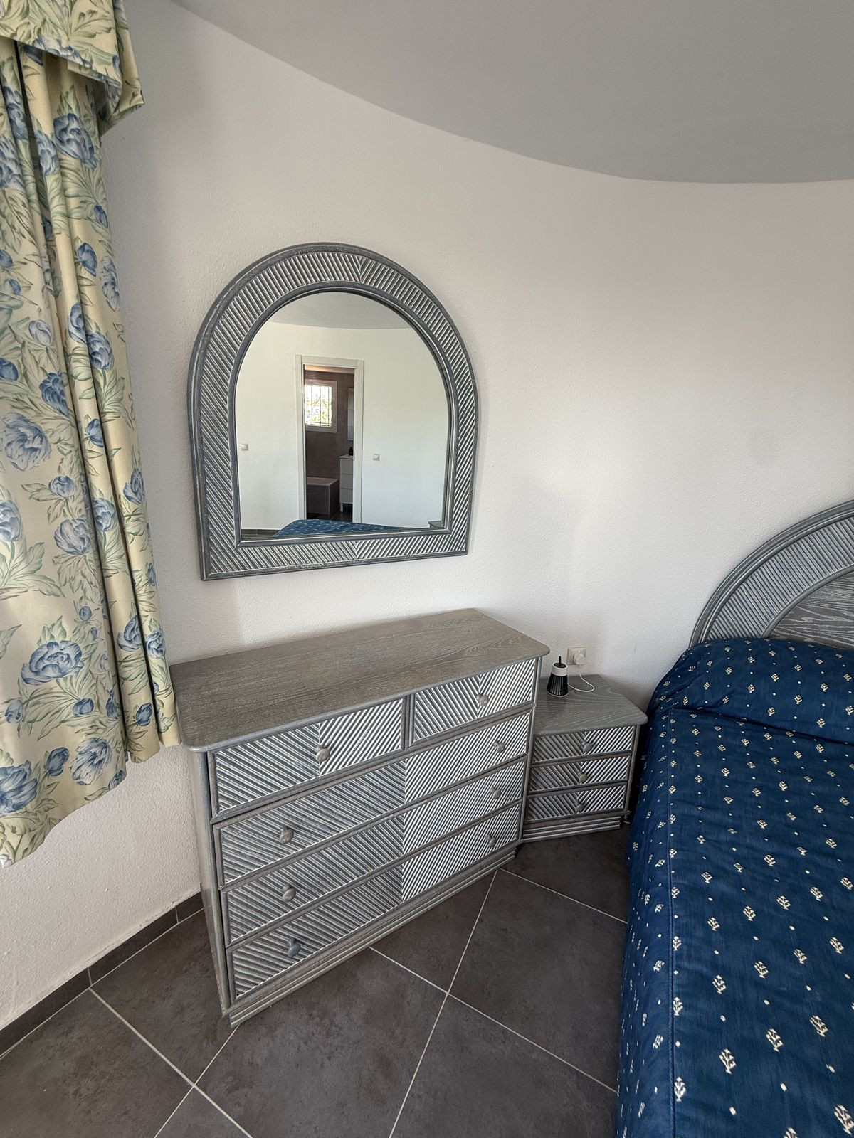 On the ground floor you have an open plan kitchen , living & dining space which leads out onto a very private covered terrace area, ideally for those summer nights. From the dining area you have access down the hallway to the guest bedroom and bathroom complete with bath. The guest bedroom is a very good size double ( currently set up with two single beds ) the bedroom also has built in wardrobes and AC.