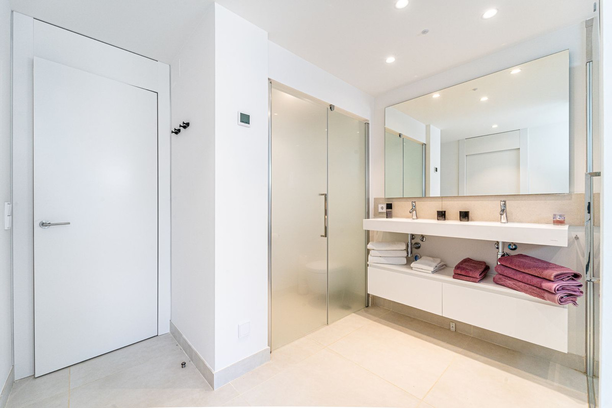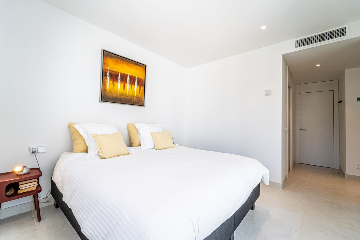 Luxury west facing apartment, in the exclusive urbanization of Higuerón West, with 3 bedrooms, 2 bathrooms, spacious living-dining room, open plan kitchen fully furnished and equipped with electricial appliances from Bosch including american fridge/freezer and wine cooler, laundry area with washing machine/dryer, large terrace of 54m2 with garden views. Master bedroom with walk-in closet, open plan bathroom and access to a small terrace of 5m2. Air conditioning hot and cold, video intercom, domotic system, built-in wardrobes in all bedrooms and hall entrance, electric awnings on main terrace and electric curtains in living room, pre-installation alarm system, floor heating in both bathrooms. Includes two parking spaces and one storage room.